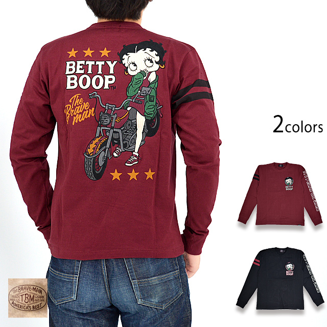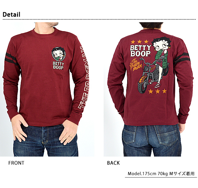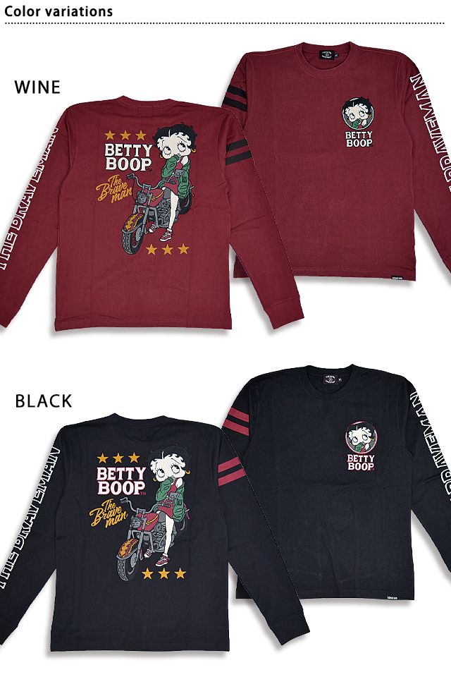 1920年代~40年代にアメリカでワークウェアを中心とした製品を世に送り出したブランド「The BRAVE-MAN」から「BR×BETTYコラボ 天竺ロングTシャツ(BBB-2301)」のご紹介です。 大きな瞳とぽってりした赤い唇が印象的な女の子、ベティ・ブープ(Betty Boop)。 キュートだけどセクシーで女性らしいルックスは、世界中のファンを虜にしています。 背中には愛車に跨るベティの姿が刺繍で落とし込まれています。 ミリタリーブルゾン×セットアップにスニーカーというコーディネートがとってもキュート。 ブランドロゴとスターにはプリントを用い、奥行きのあるデザインに仕上げました。 バックにしっかり柄を入れている分、フロントはシンプルにデザインし、メリハリを付けました。 左胸にはベティの刺繍ワッペンを配置。 右袖にはダブルラインを、左袖にはブランドロゴをプリントしました。 ボディーには、ややしっかりとした刺繍に負けない強さを持ったTシャツ生地を採用。 襟元、袖口にはリブを縫い付け、野暮ったさを軽減しました。 カジュアルに着こなしに取り入れることの出来る、大人のキャラクターアイテムです。 | ||||||||||