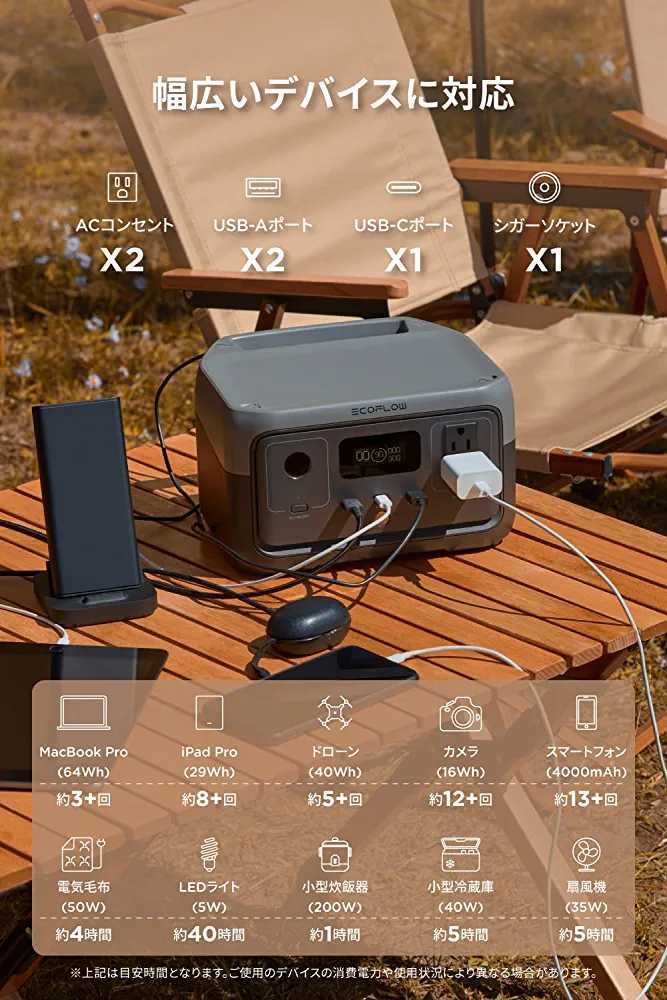 AC2口・USB‐A2口・USB‐C1口・シガーソケット1口合計6出力ポートが備わっており、スマートフォンやタブレット、ノートパソコン、電気毛布、冷蔵庫、炊飯器、扇風機、水槽、テレビ、照明など、幅広いデバイスを長時間にわたってご使用いただけます。