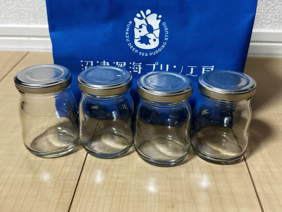 ★沼津深海プリン工房★プリン容器★空き瓶★フタ付き★4個セット★袋&台座付き★です。