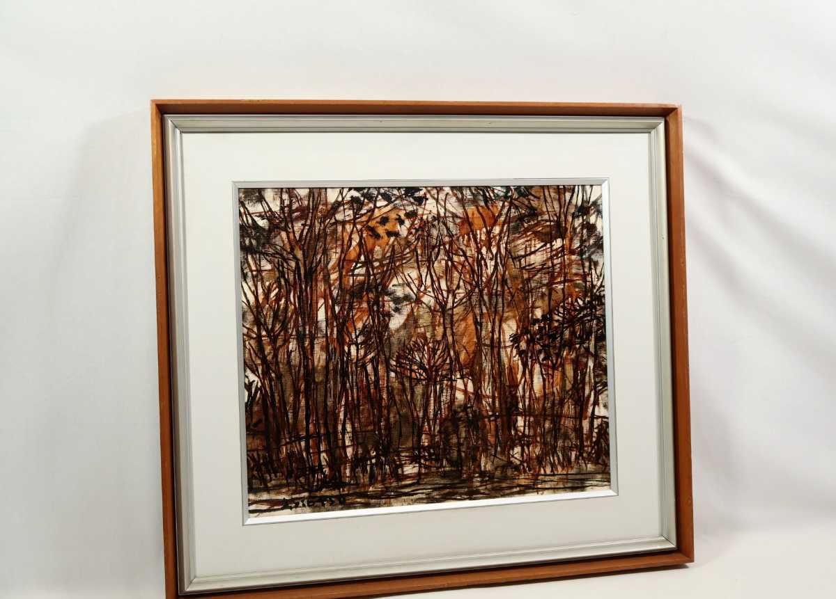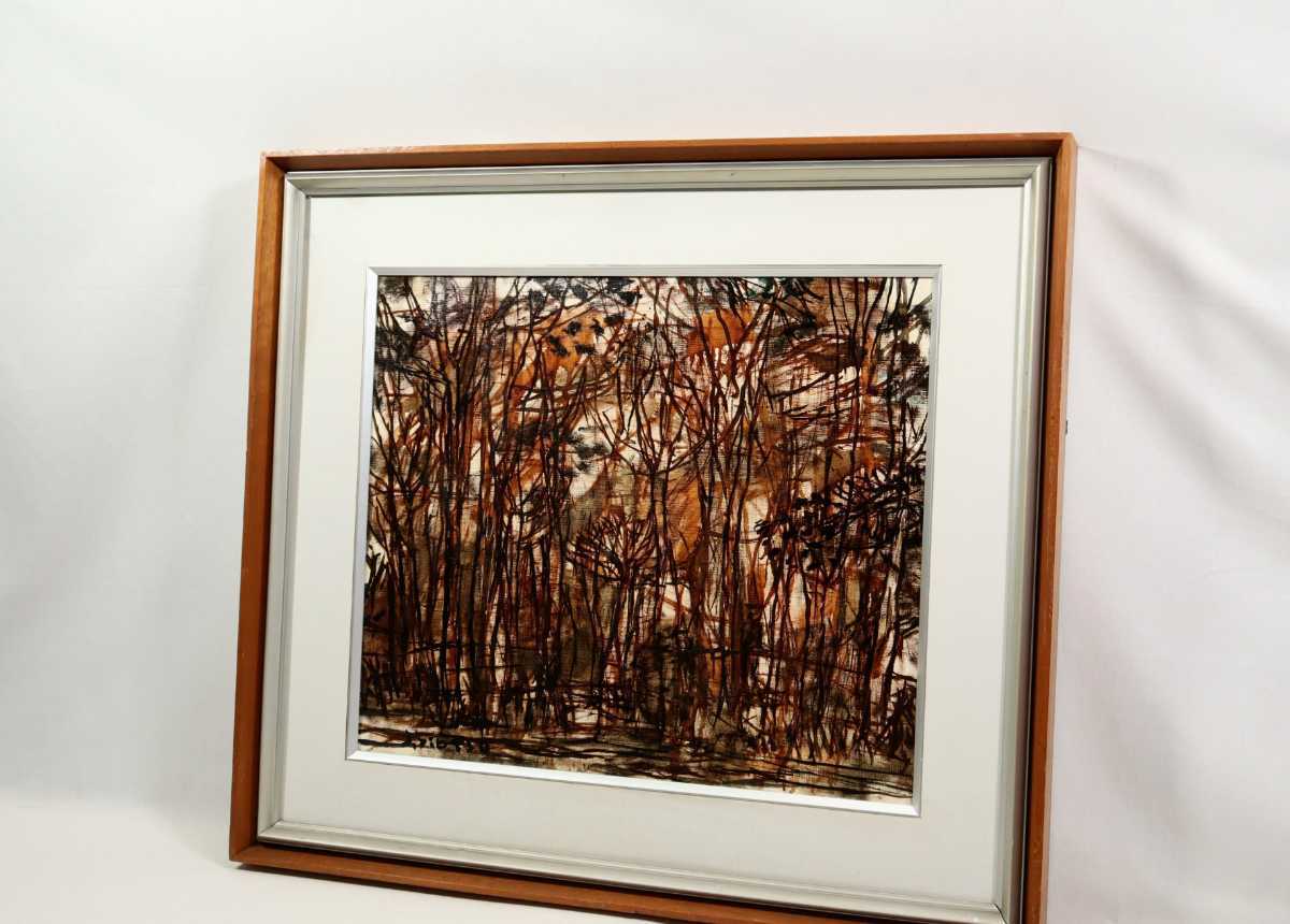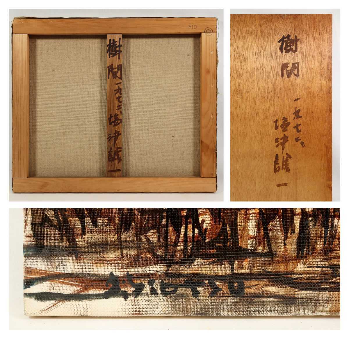 真作 塩津誠一 1972年油彩「樹間」画寸 F10 岡山県出身 東光会審査委員 好んで描いたモチーフ 鬱蒼と生い茂る様を力強くも早い筆致 7032