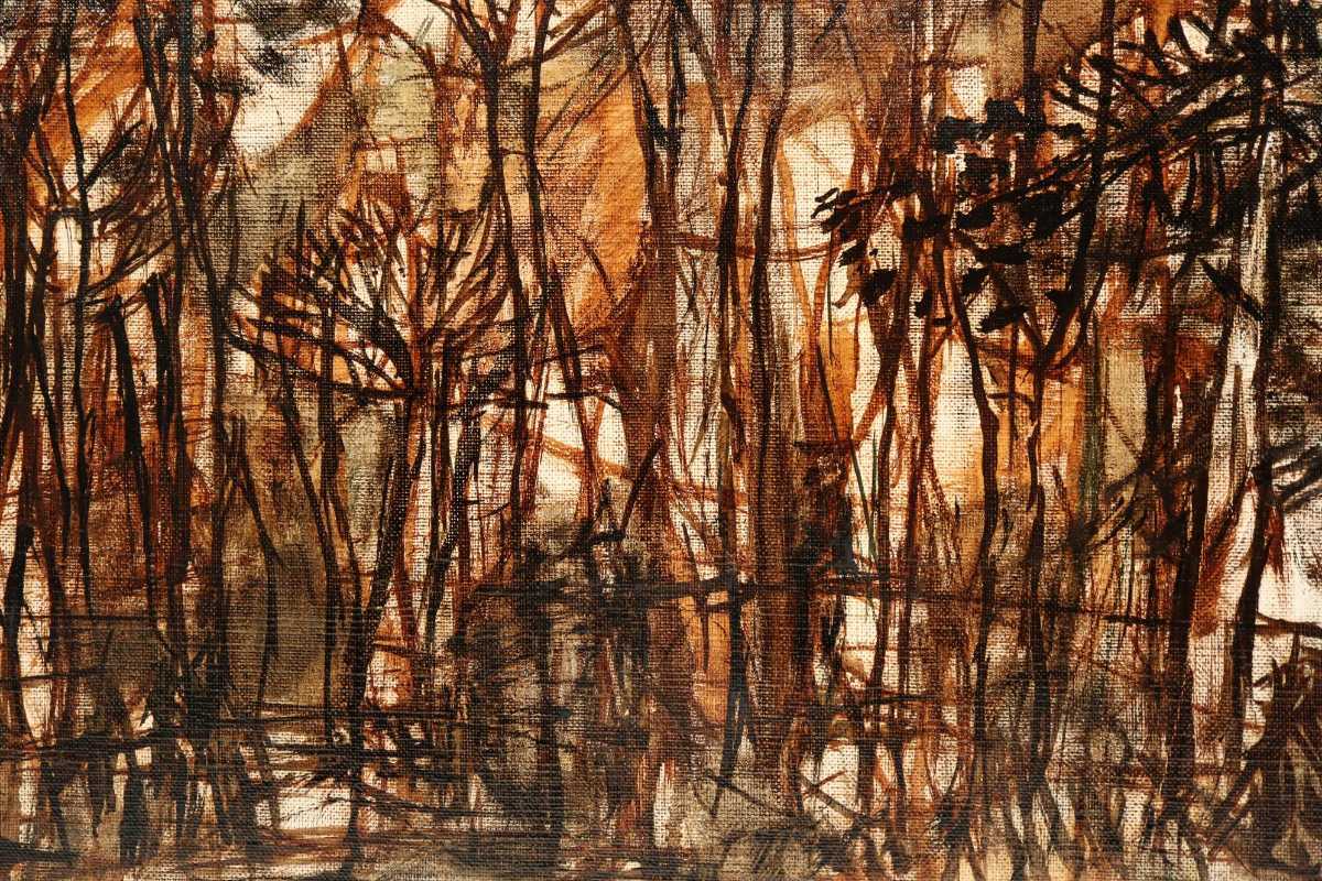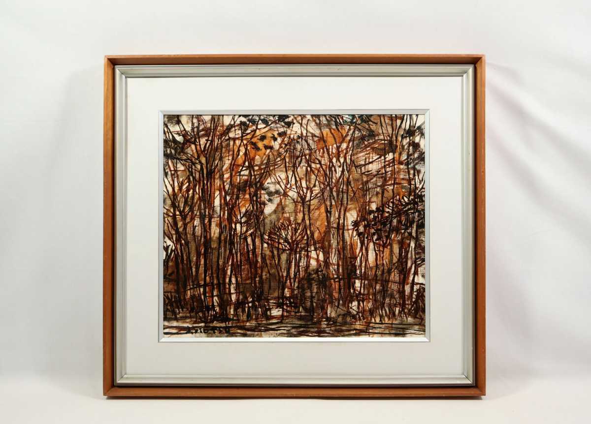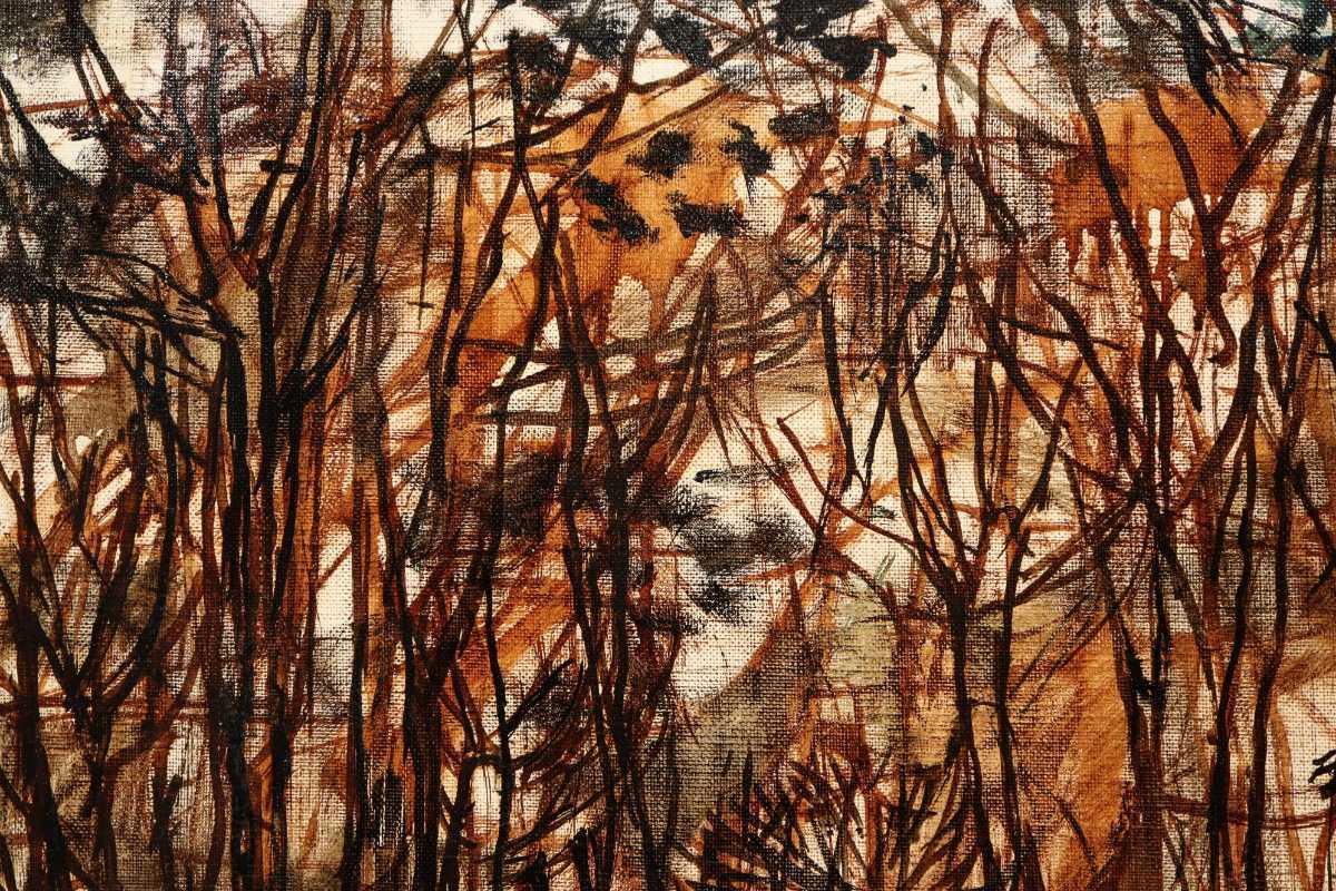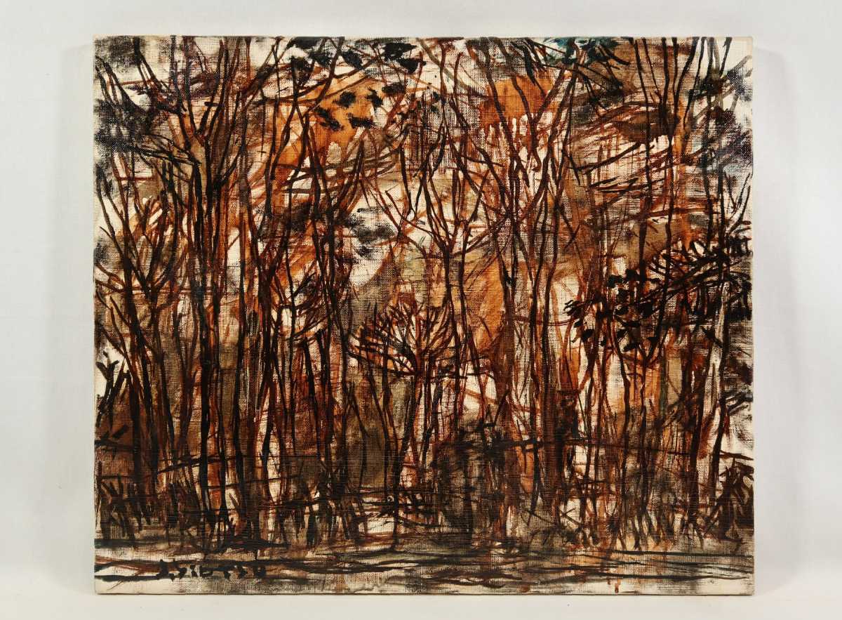 真作 塩津誠一 1972年油彩「樹間」画寸 F10 岡山県出身 東光会審査委員 好んで描いたモチーフ 鬱蒼と生い茂る様を力強くも早い筆致 7032