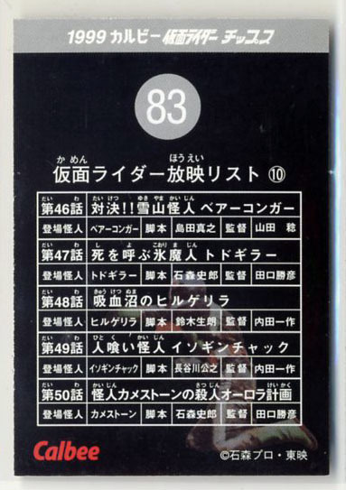 | ◆防水対策 厚紙補強 カルビー 仮面ライダーチップスカード(1999 復刻版) 83番 仮面ライダー放映リスト・10 トレカ 即決 | |