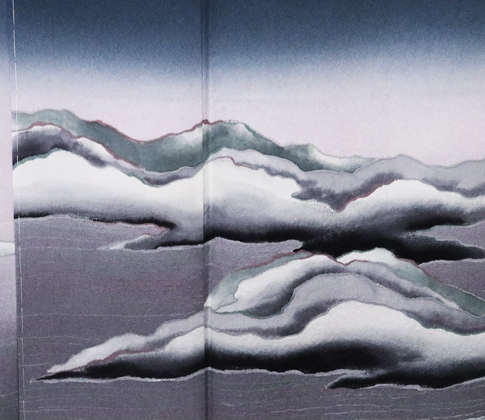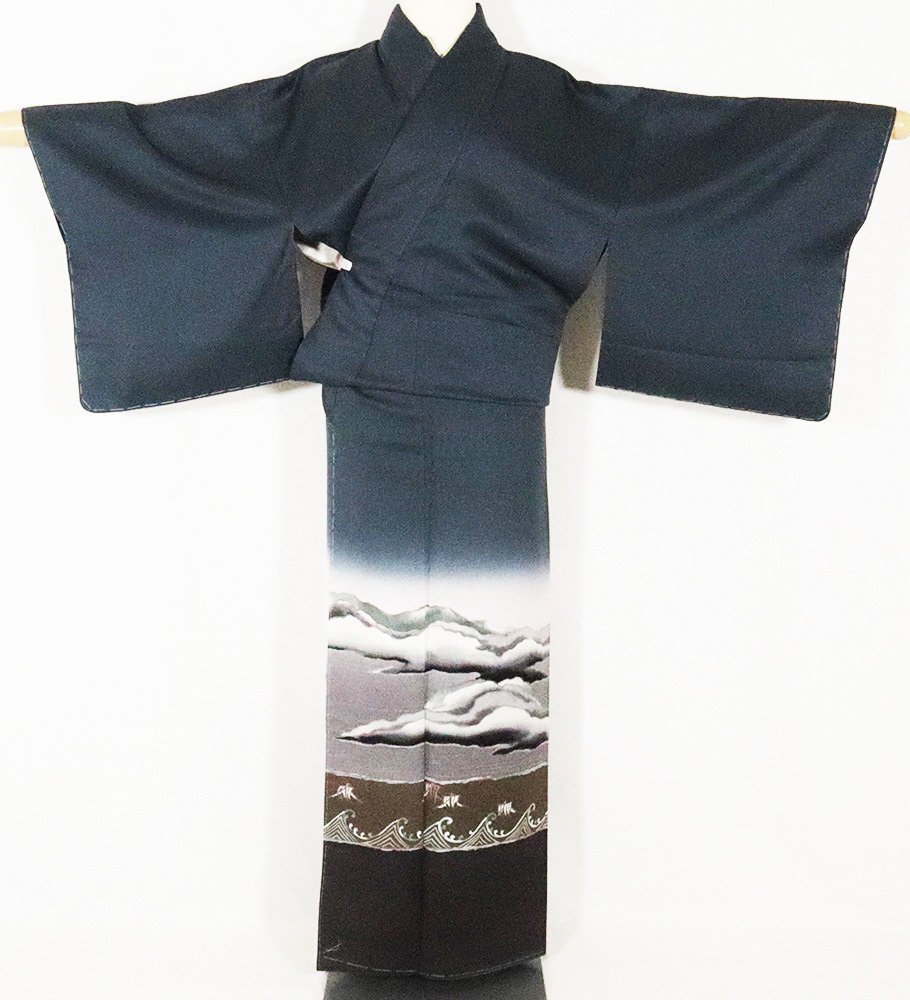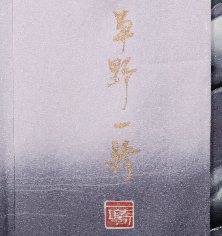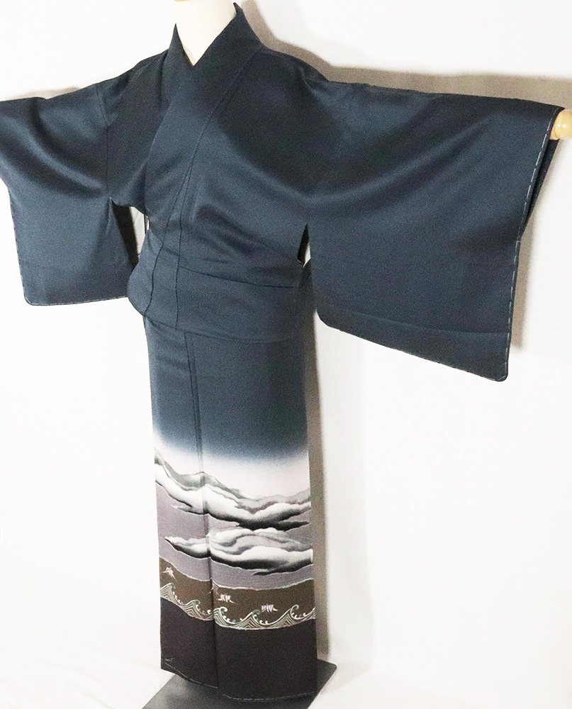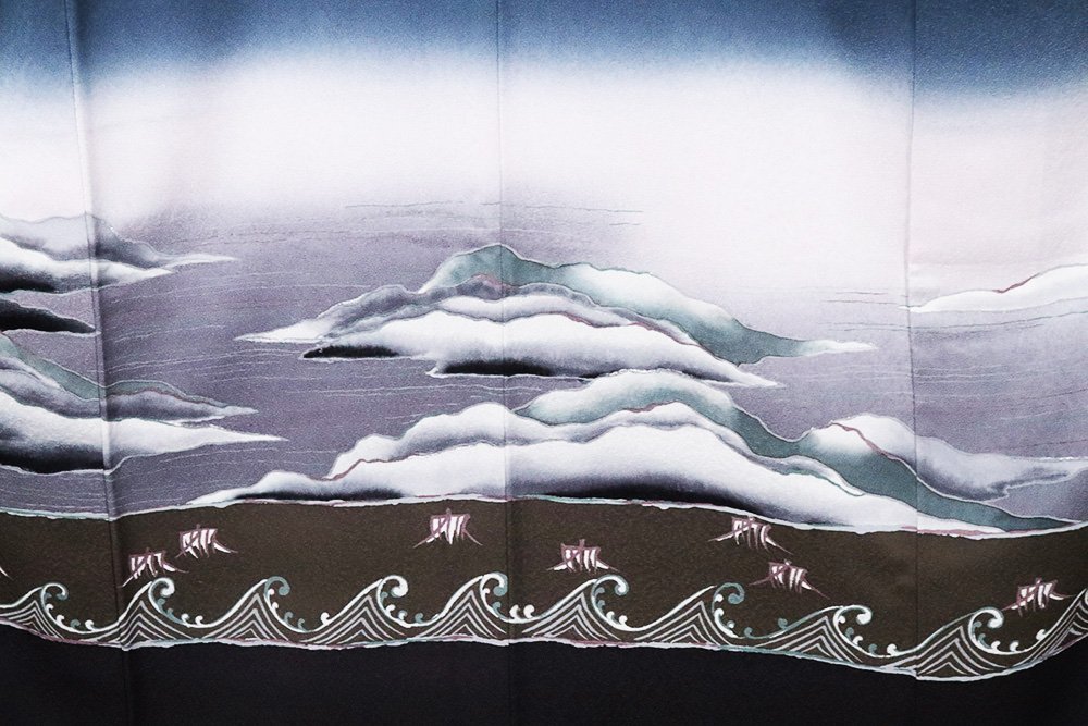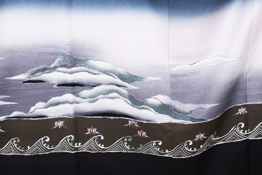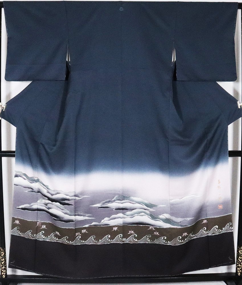 | 草野一騎氏作 友禅色留袖 袷 丹後縮緬地 緑・グレー・茶色・薔薇地模様地 雲海に荒波・横縞 162 広襟 一つ紋 未使用品 仕付け付き | |