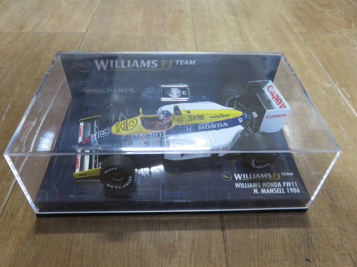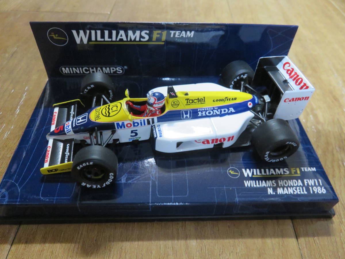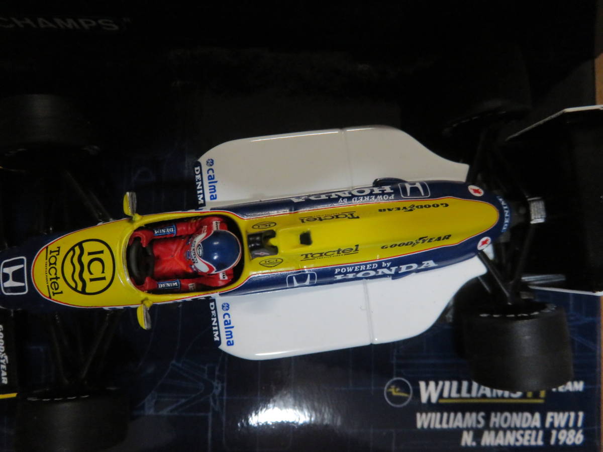 この頃のF1が一番面白かった! ミニチャンプス(PMA) 1986年 ウイリアムズFW11・ホンダ ナイジェル・マンセル 美品です。 写真の通り、ドライバーのスーツまでデカールが施されている傑作品です。 おまけとして、ウイリアムズホンダ(マンセル、ピケ)のステッカー付 ノークレームノーリターンでお願いします。