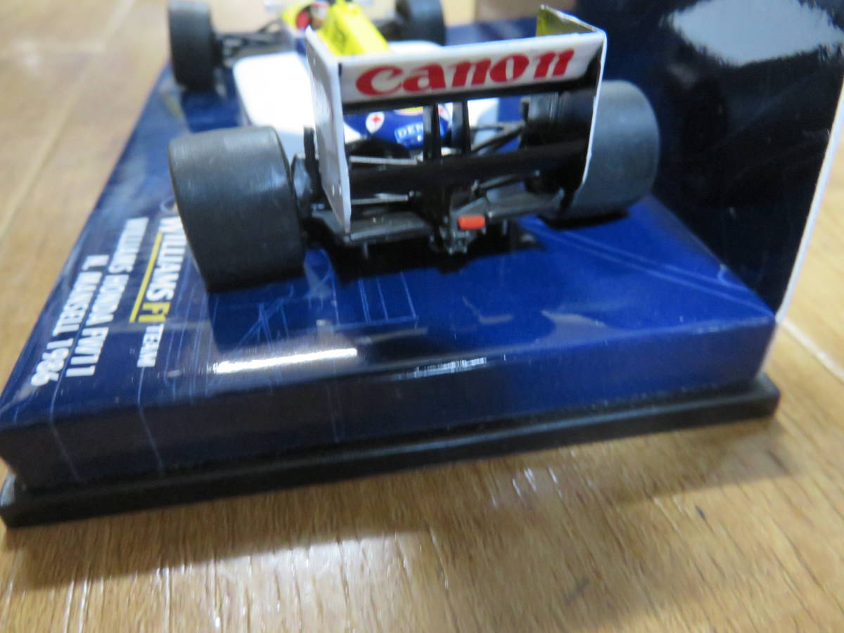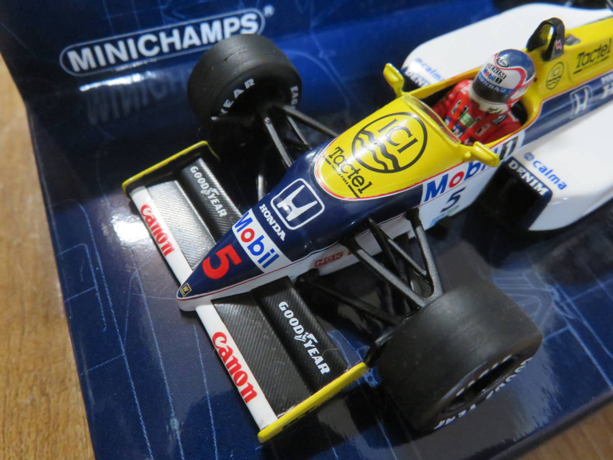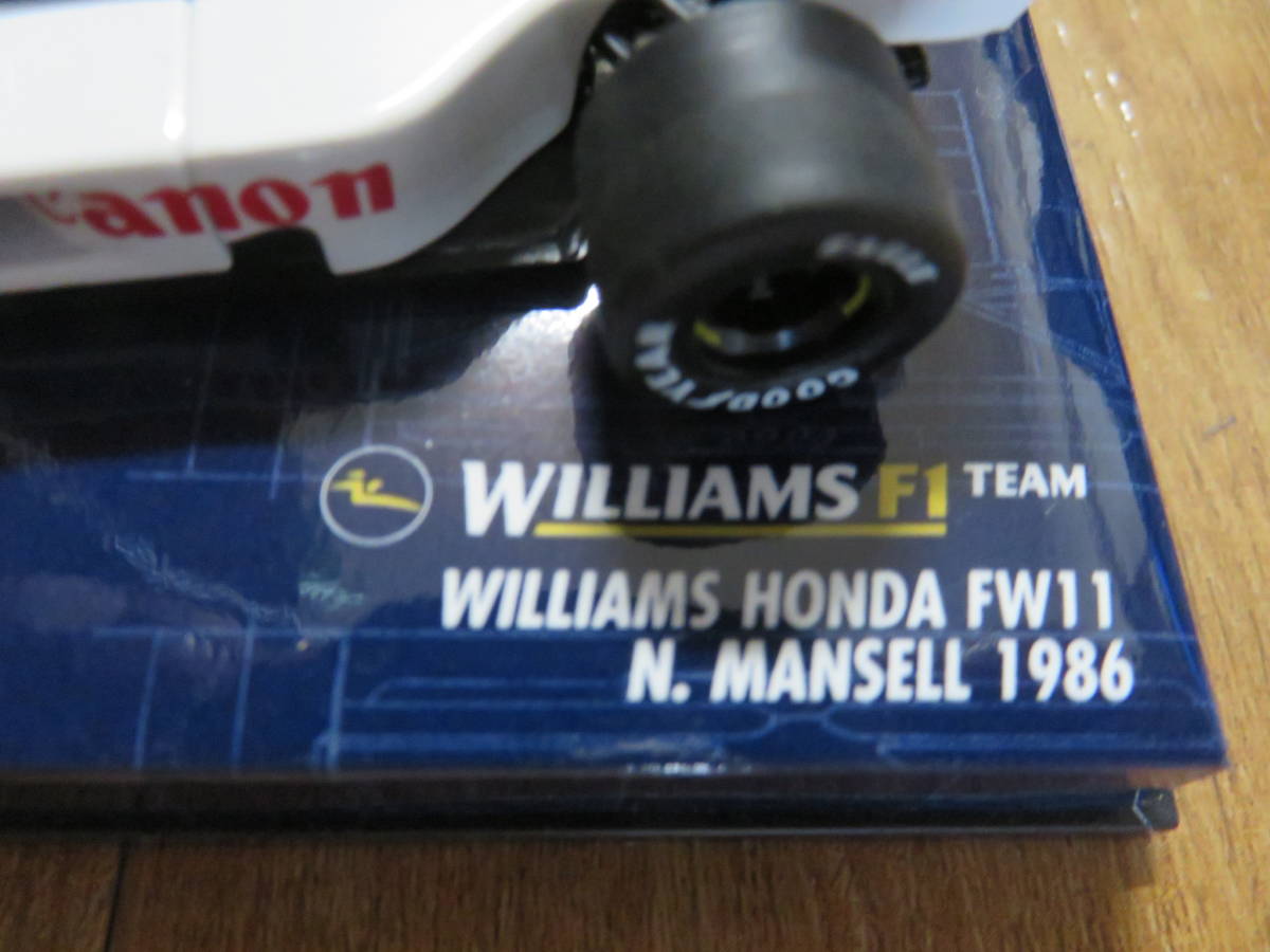 この頃のF1が一番面白かった! ミニチャンプス(PMA) 1986年 ウイリアムズFW11・ホンダ ナイジェル・マンセル 美品です。 写真の通り、ドライバーのスーツまでデカールが施されている傑作品です。 おまけとして、ウイリアムズホンダ(マンセル、ピケ)のステッカー付 ノークレームノーリターンでお願いします。