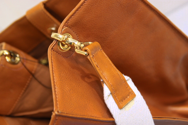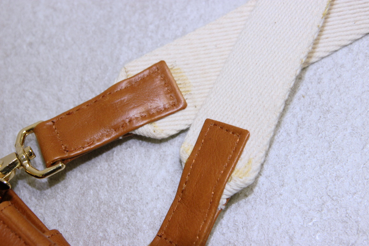 ショルダーのキャンバス部分に製造段階で使用するレザー用ボンドの滲みが見られます。