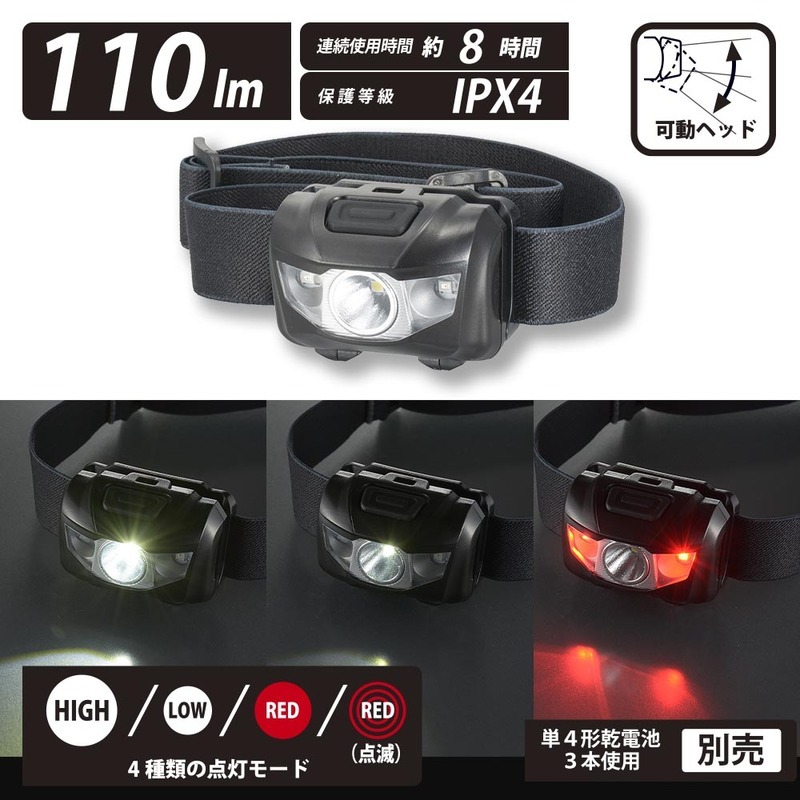■ 連続使用時間:明るさ10%まで…約8時間/HIGH(ハイ)モード、約60時間/LOW(ロー)モード ※未使用・新品のアルカリ乾電池使用時