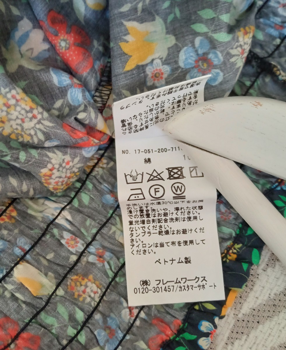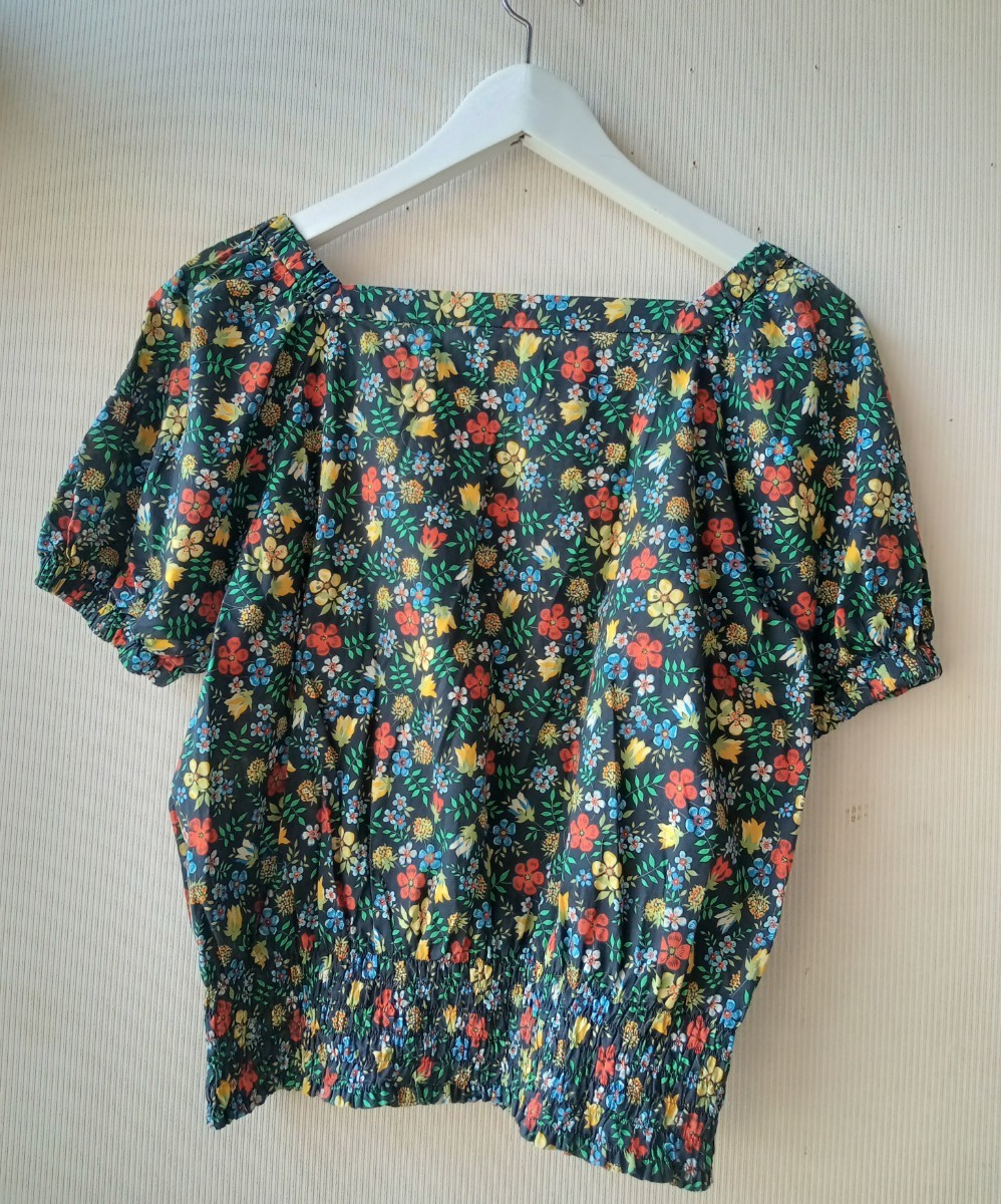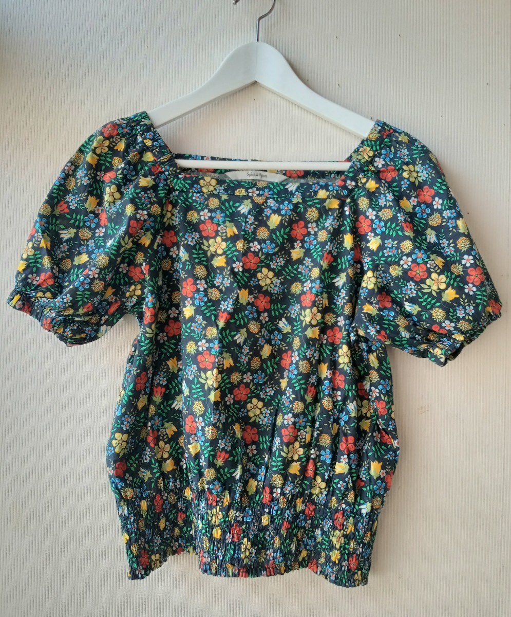 リバティの花柄生地にパフスリーブと裾のギャザーゴムが可愛いです。