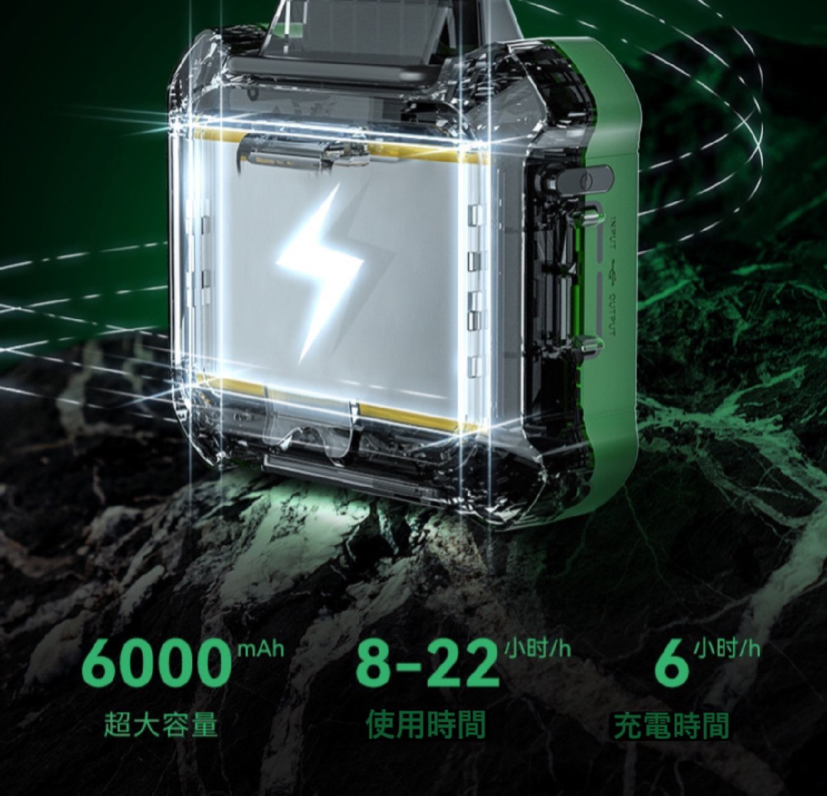 「6000mAh電池」大容量6000mAh電池内蔵で、約7.5-21H長時間使用可能。夏にお出かける時におすすめします。また急速充電対応のUSB Type-Cを採用しているので、約6時間でフル充電が可能です。USB出力ポートが搭載しているので、スマホに充電も可能です。<br>