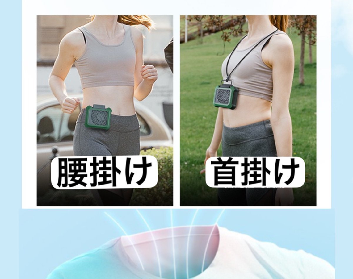 吹出口を上に向けてフックをズボンやベルトに取り付ければ、服の中に涼しい空気を送り込めます。また、外側のフックに服を留めておくことで体と服の間に空間ができ、より効率よく体を冷やすことが可能です。<br>