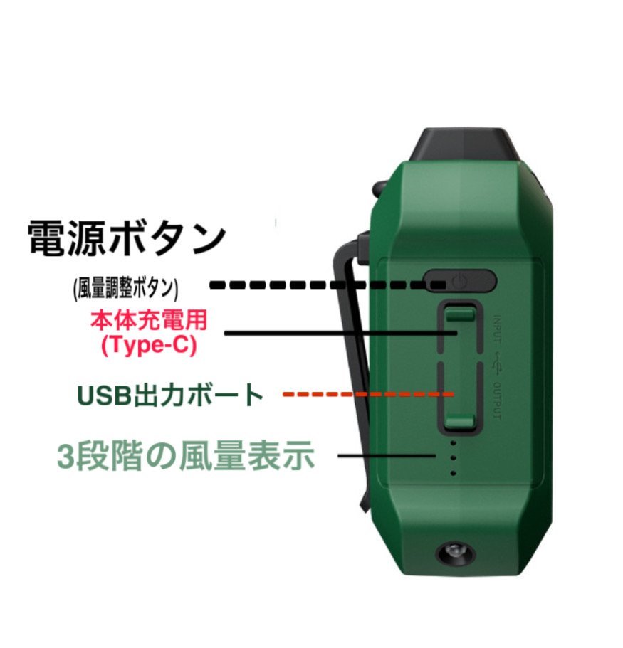 「3段階風量調節&パワフル風量」扇風機の風量が弱、中、強の3段階に設計され、熱さによって自由に選択可能です。シャツの内側に向ければ汗ばんだ背中を涼ませることができます。また、ベルトの背中側につければリュックと背中の間のムレを解消。<br>