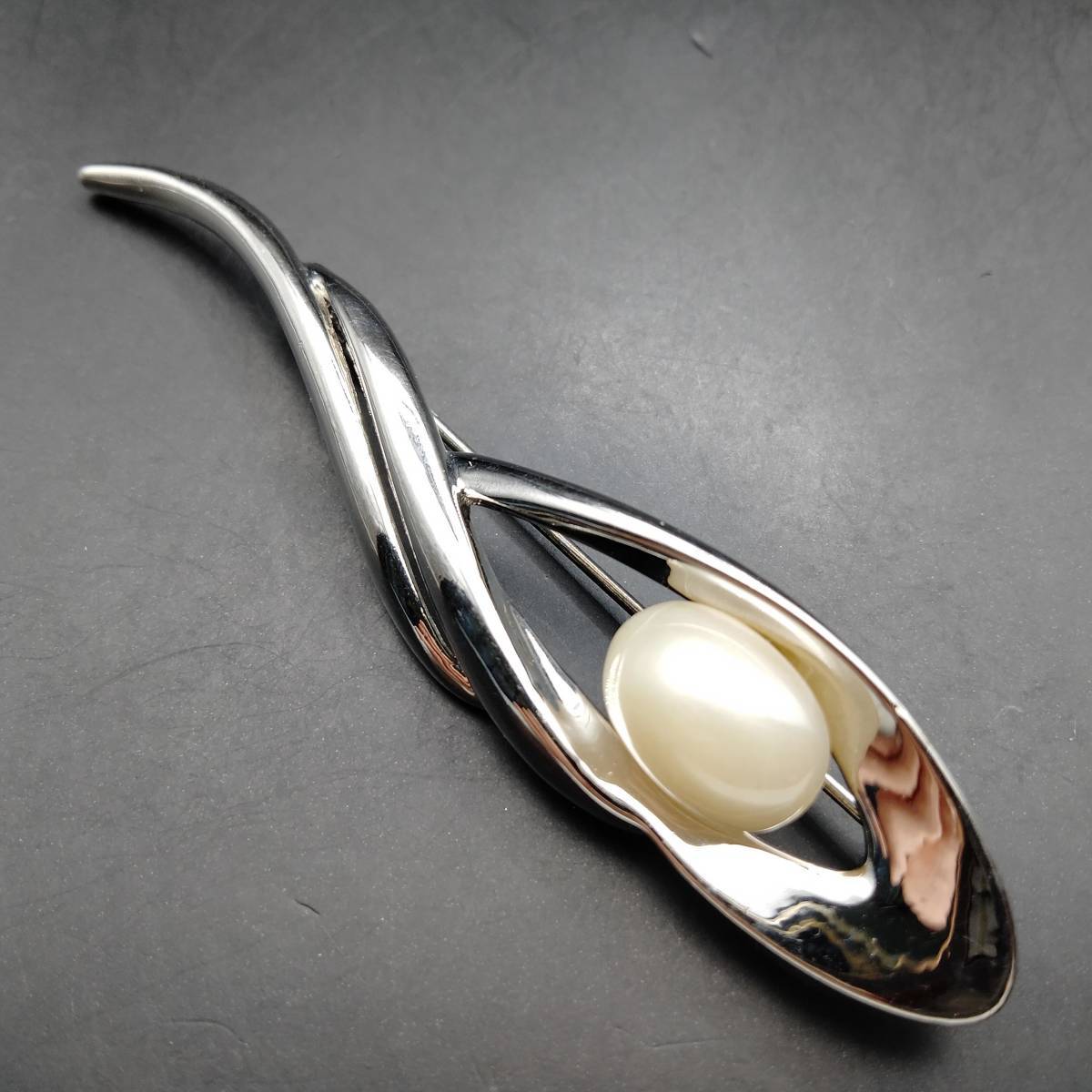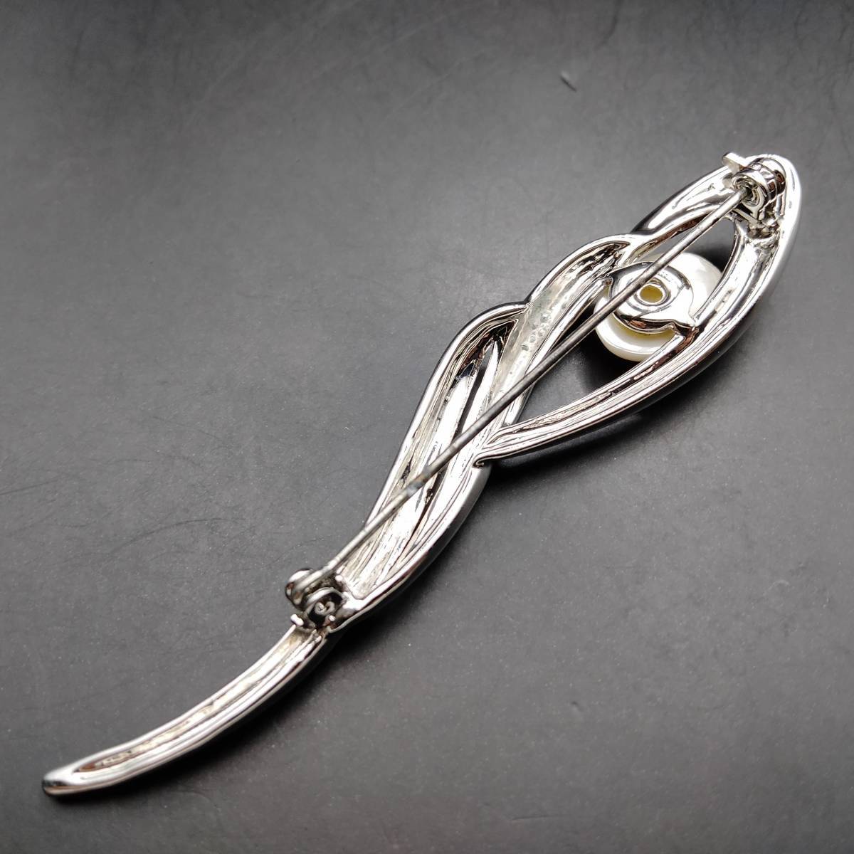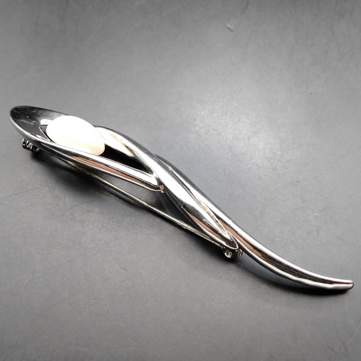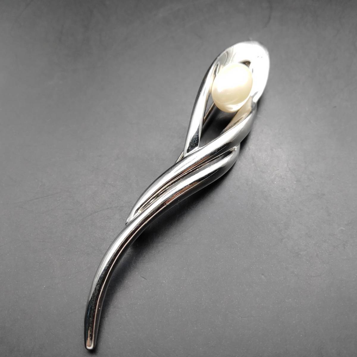 ホワイト フェイク パール カーブ シルバートーン ビンテージ ブローチ 昭和レトロ コスチューム ジュエリー 輸入 7S-X