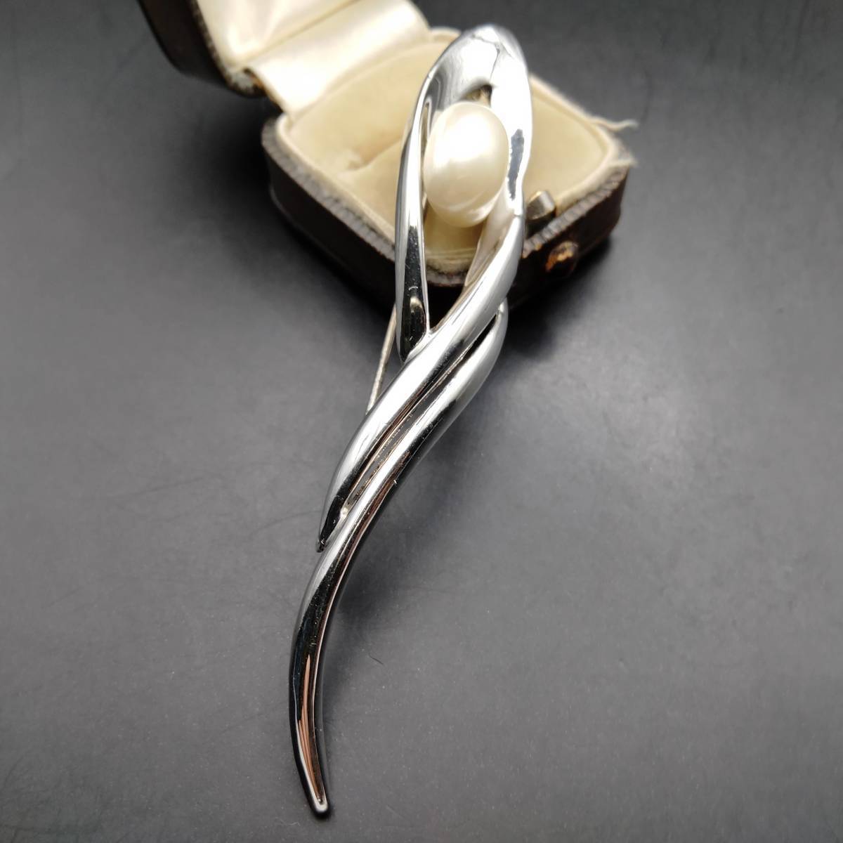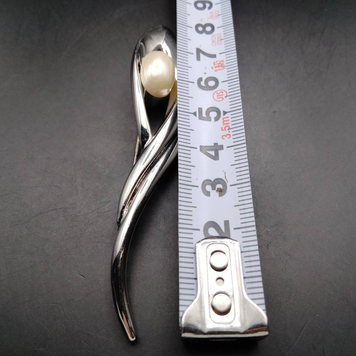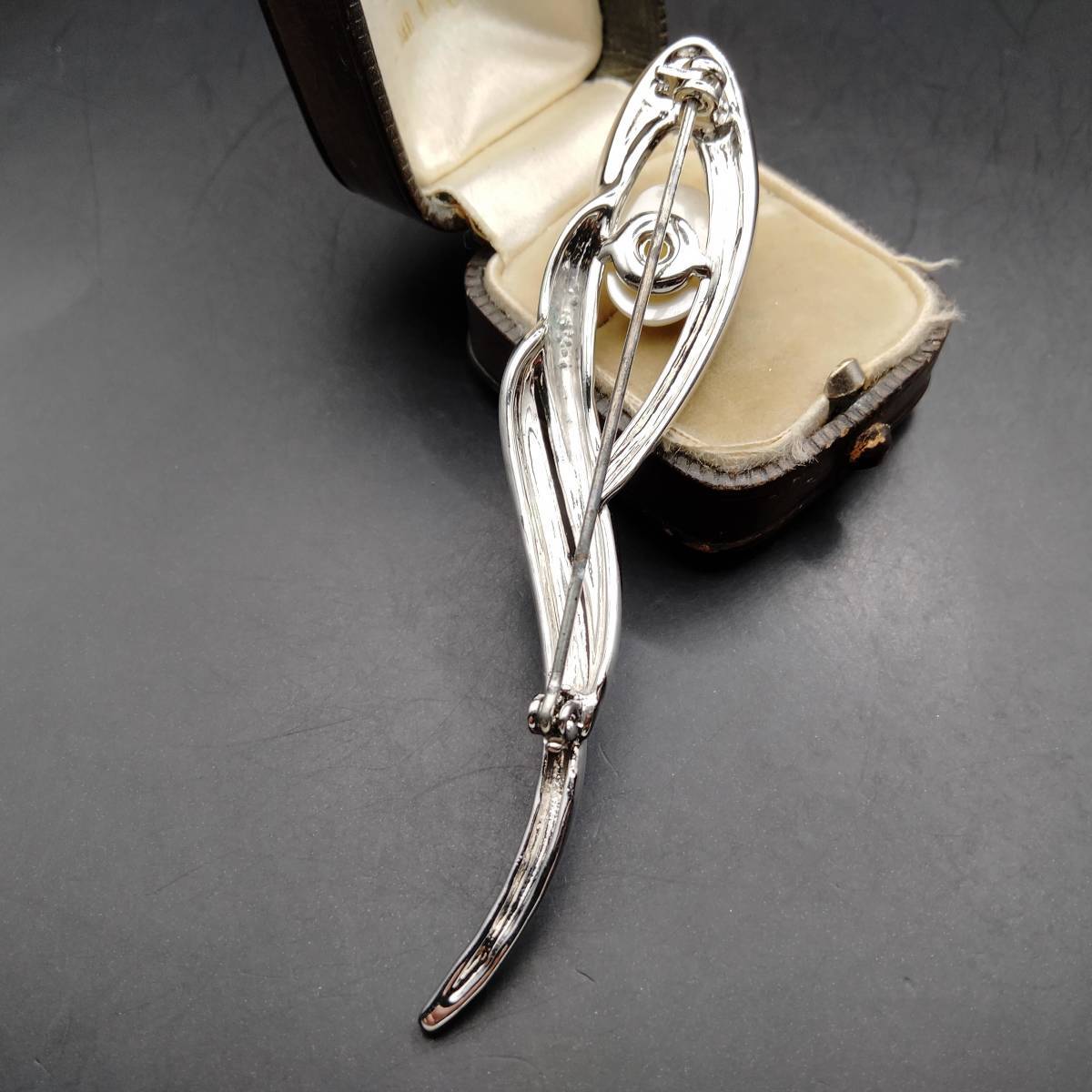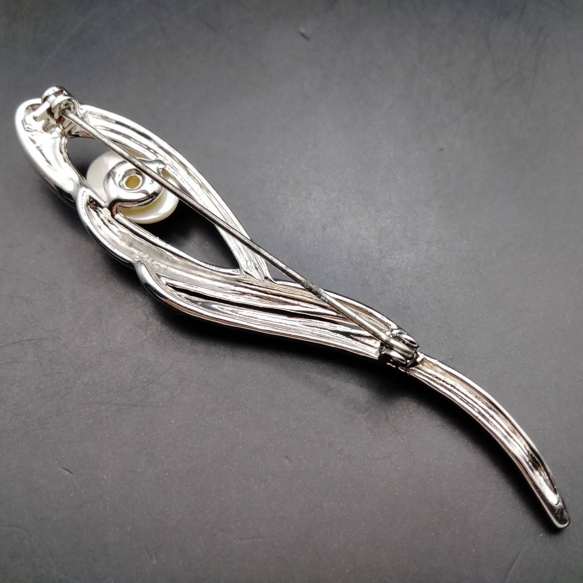 ホワイト フェイク パール カーブ シルバートーン ビンテージ ブローチ 昭和レトロ コスチューム ジュエリー 輸入 7S-X
