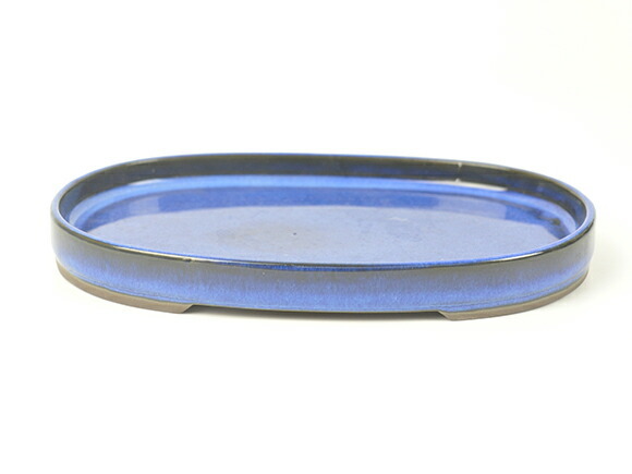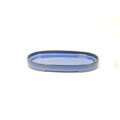 水を貯めたて石を置いたり、ミニチュアの枯山水を作ったりする器です。盆栽鉢を置いても雰囲気が良くなります。夏場の乾燥防止の受け皿としても使用できます。盆栽鉢の有名産地、三重県の四日市地方で作られる万古焼の器です。釉薬のかかった美しい鉢色が魅力です。生子(青色)の5号サイズです。4号鉢を置くのにぴったりなサイズです。
