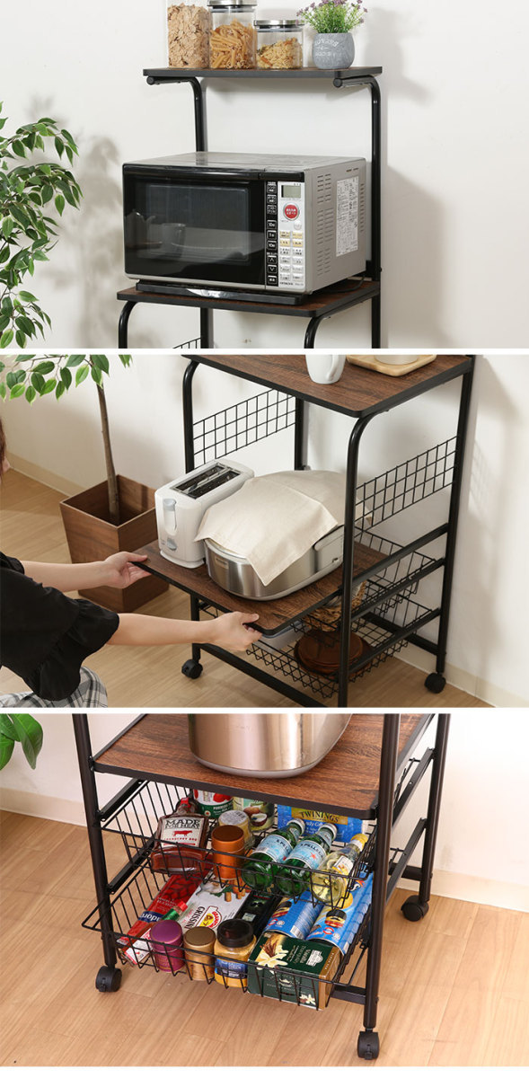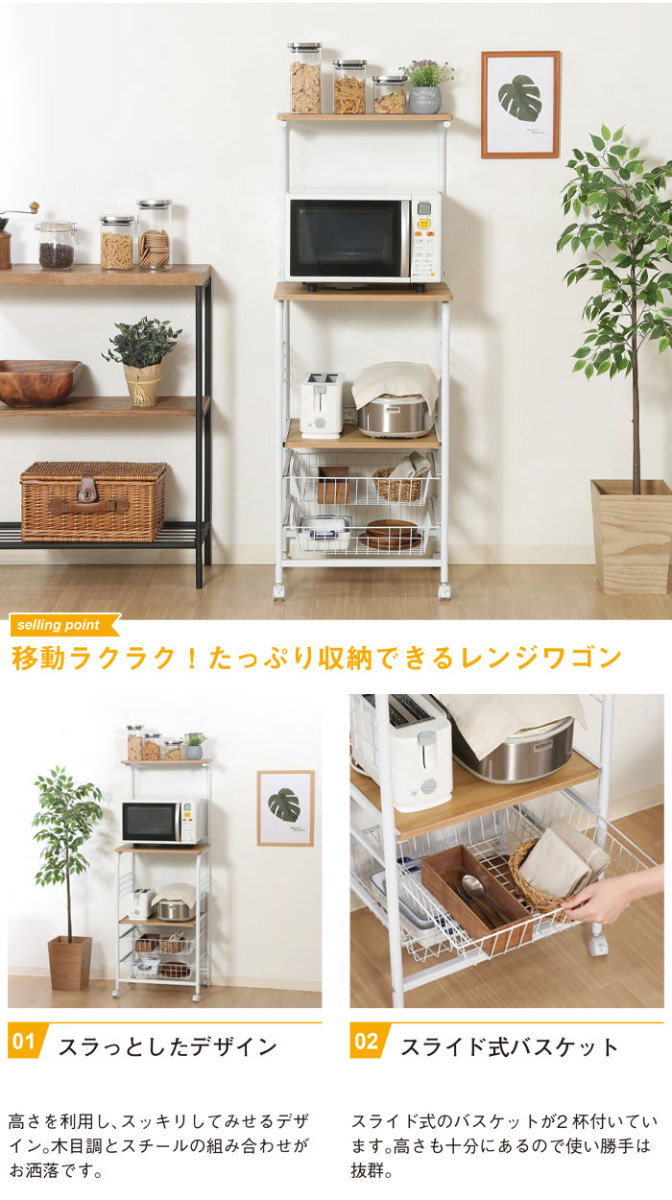 | 木目調とスチールの組み合わせがおしゃれなレンジワゴン。 高さを利用した場所をとらないスリムな設計。 使いたい時にすぐ手が届くオープン収納。 家電用品を置いたり、作業台としてもお使いいただけます。 中間の棚(約幅49×奥行40cm)は前に引き出すことができ、炊飯器などを置くのに便利。 スライド式のバスケットが2杯ついているので、たっぷり収納できます。 キャスター付きなので移動もラクラク。 移動させないときはキャスターについているストッパーで固定(2か所)できます。 |