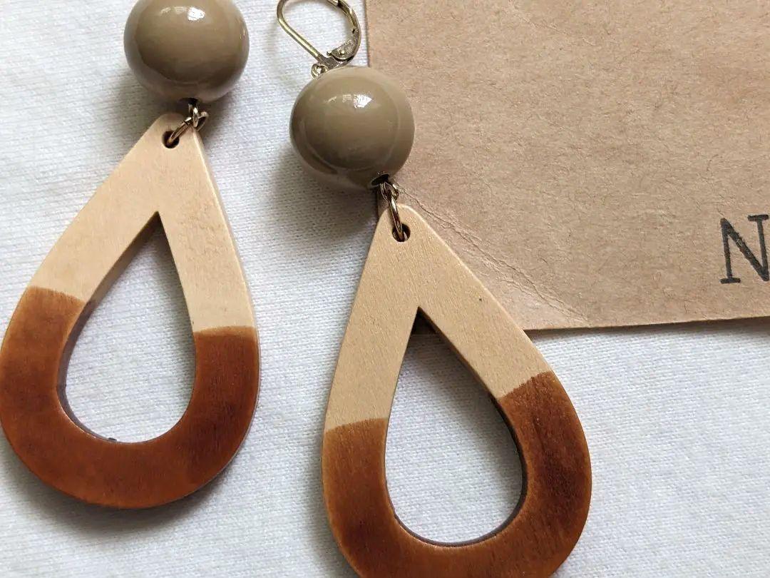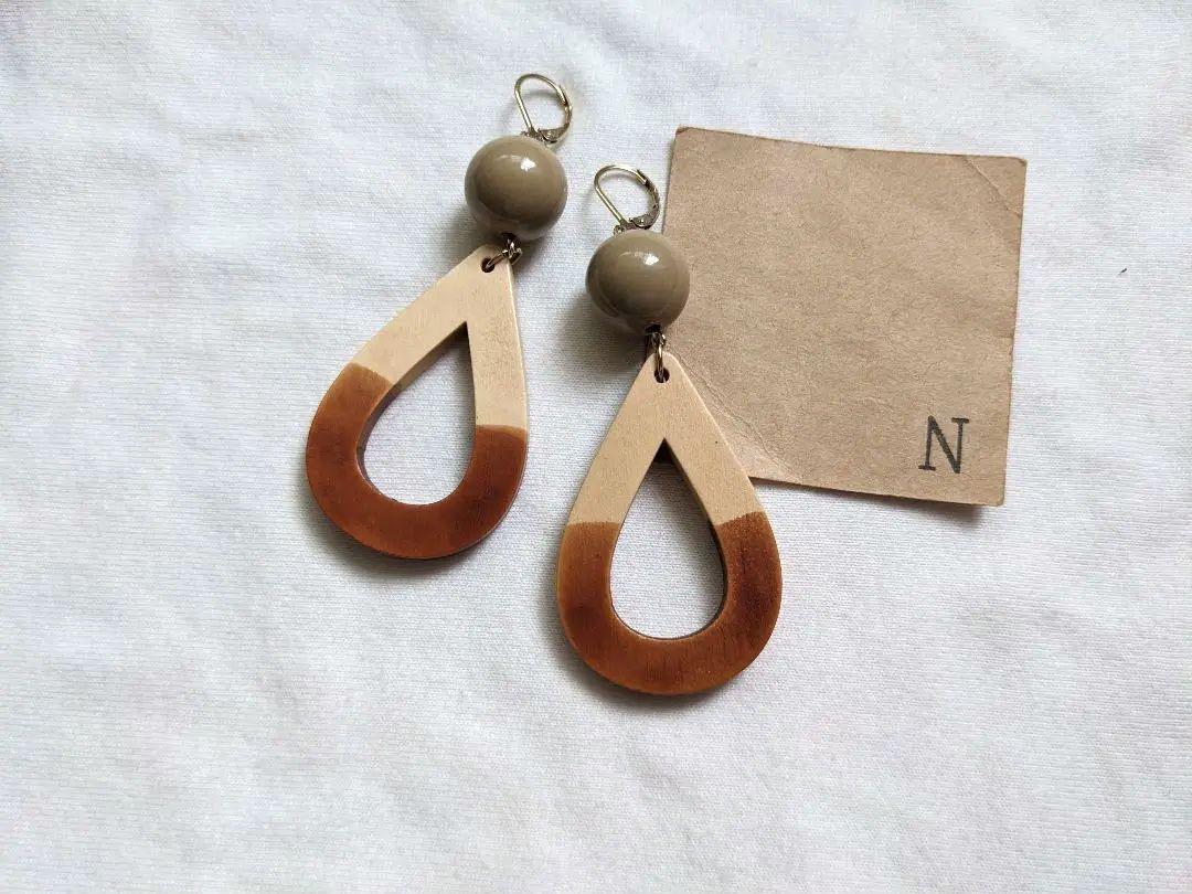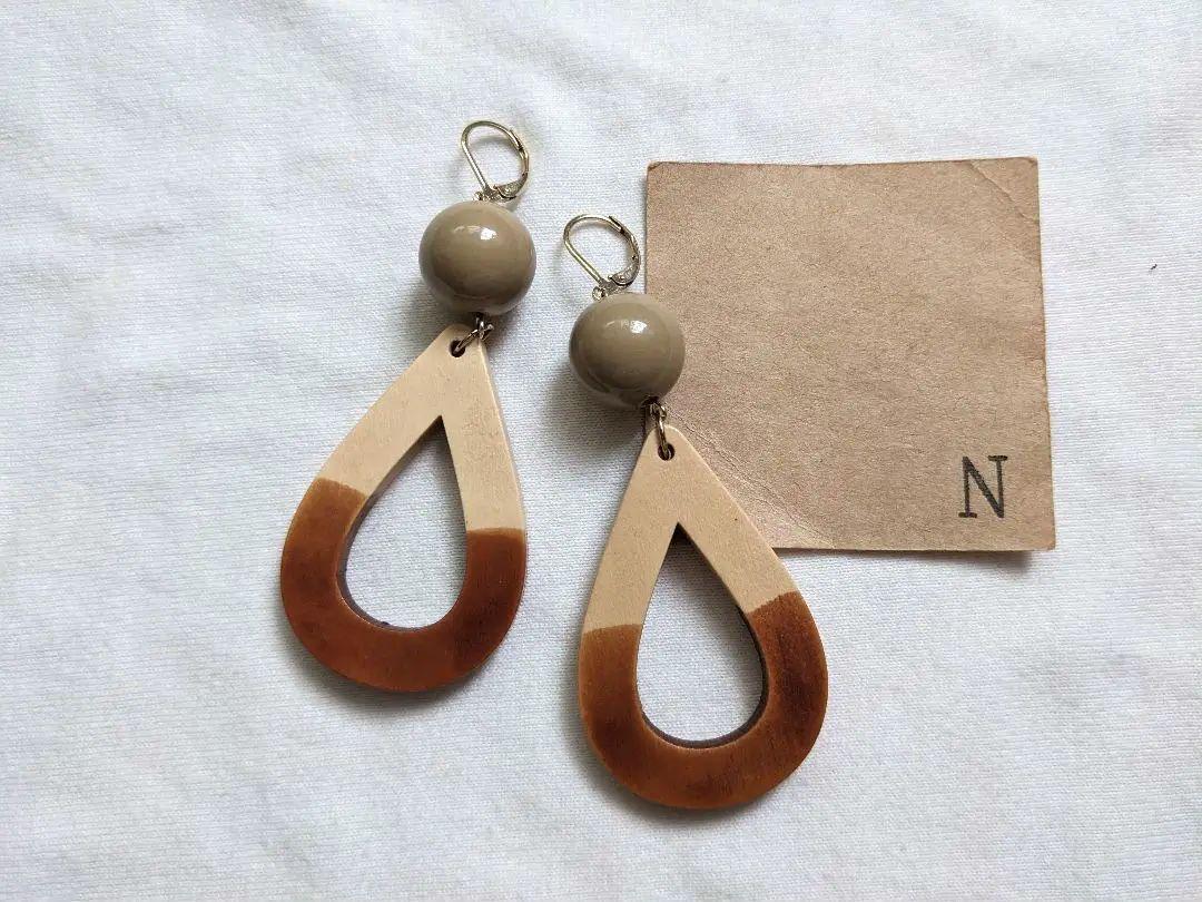 ドロップ型の2カラーウッドパーツとベージュビーズを使いましたピアスです。大ぶりピアスでお洋服のアクセントに。リゾートスタイルやロングワンピースやワイドパンツ、シャツなどに。
