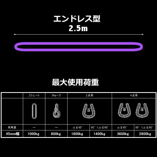 | ■ラウンドスリング 1000kg(1t)/2.5m エンドレスタイプ(新品・未使用)■ ■ピアノ、家具、石材加工品などの吊り上げ・移動・運搬、山林業などでの原木搬出・抜根・杭抜作業、柱石などの据付作業に! ■ラウンドスリング(エンドレスタイプ)1本売りです。 【仕様】 ■ベルトサイズ:幅45mm×長さ2.5m(全周囲5m) ■最大使用荷重 ・ストレート吊:1000kg ・チョーク吊 :800kg ■材質:ポリエステル100% ※鋭角なところにベルトスリングを掛ける場合はコーナーパットをご使用下さい。 ※本製品は、消耗品の一種です。安全のため、点検を必ず行ってください。 ※ご使用上の事故や損害について、当社は一切の責任を負いませんのでご了承ください。 ※輸入品に付き神経質な方はご落札を遠慮ください。 | ||