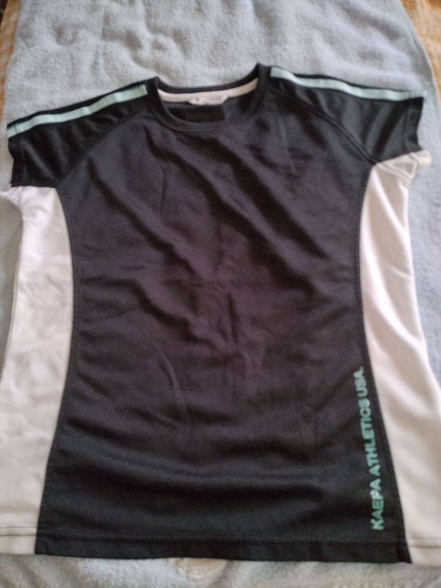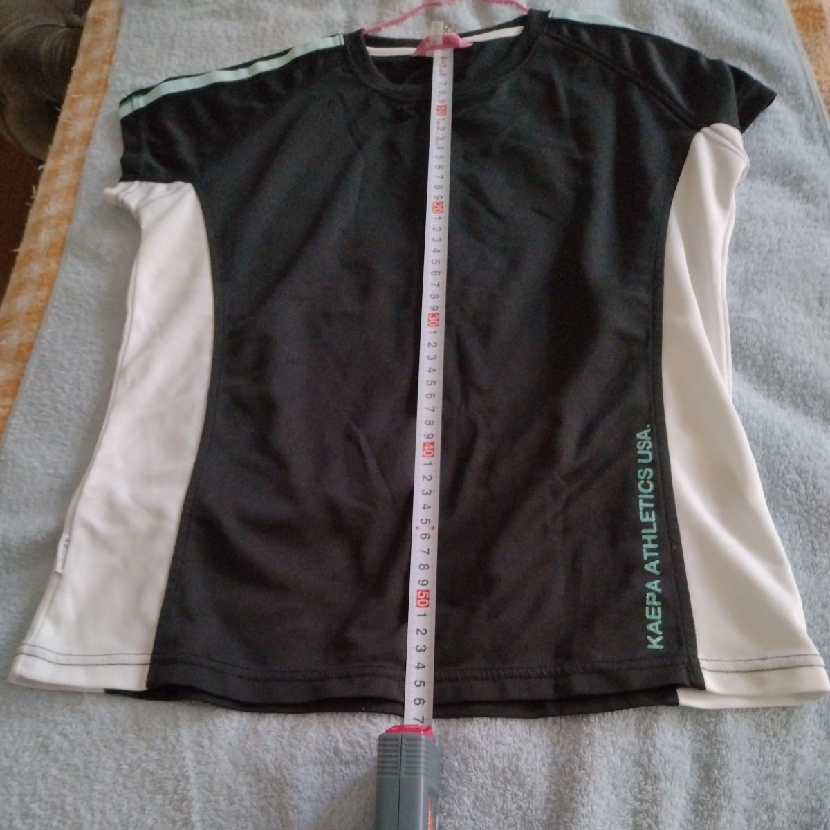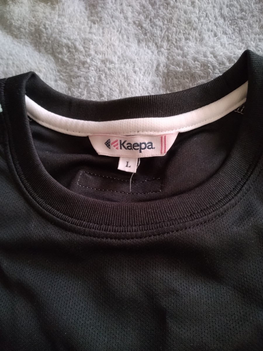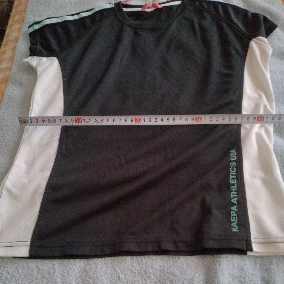 kaepaのメンズLサイズのストレッチ組成Tシャツです。素人の平置き採寸ですが、全丈55㎝裾幅45㎝袖長8㎝ぐらいです。黒地に脇腹部縦にメッシュ素材白の縁取で両肩部のグリーンストライプがアクセント効いていてエレガントです。ゆうパック紙袋若しくはパケ封筒にて東京都内から発送の予定です。尚、画像にあるメジャーはサイズ感を伝え易くするための比較物であり商品の付属品ではございません。