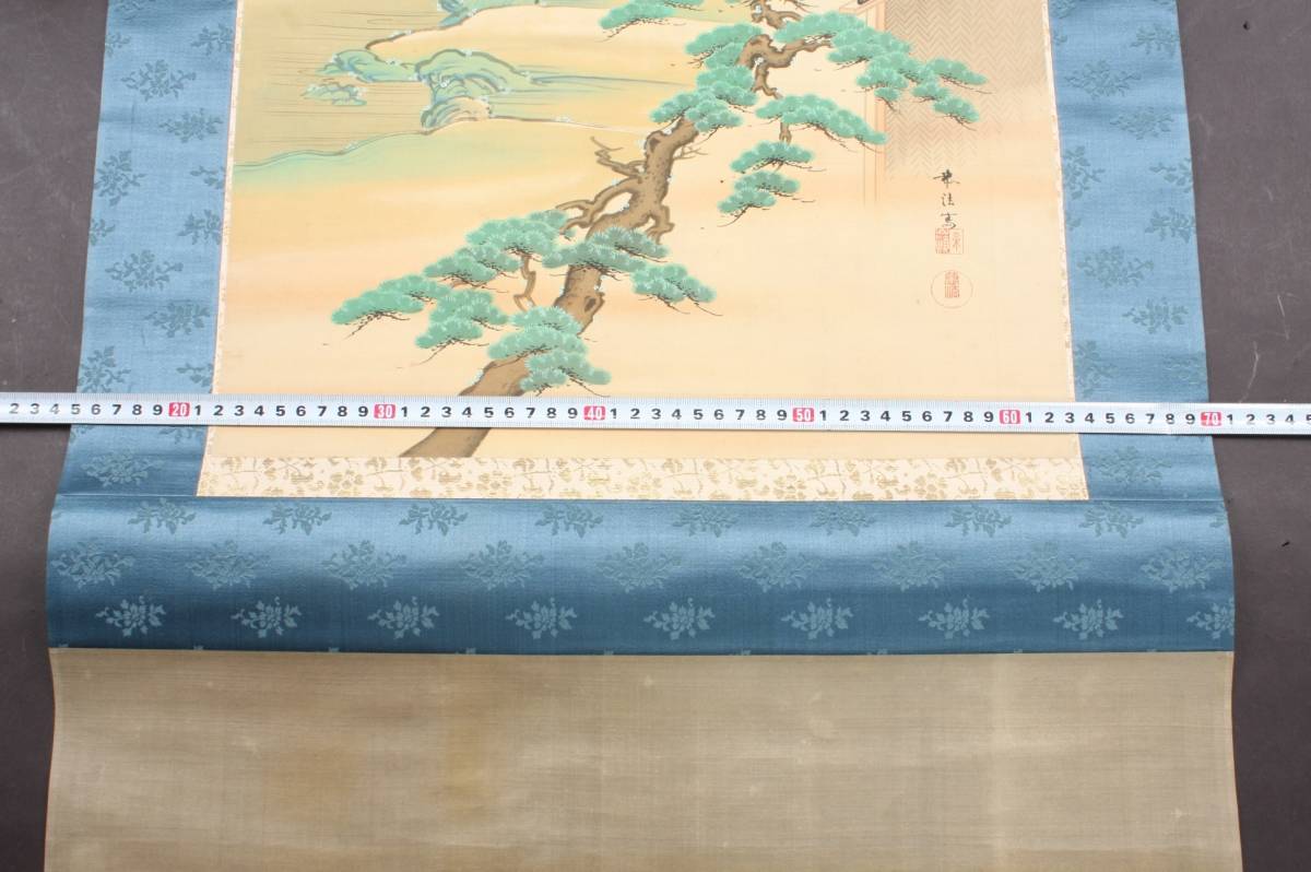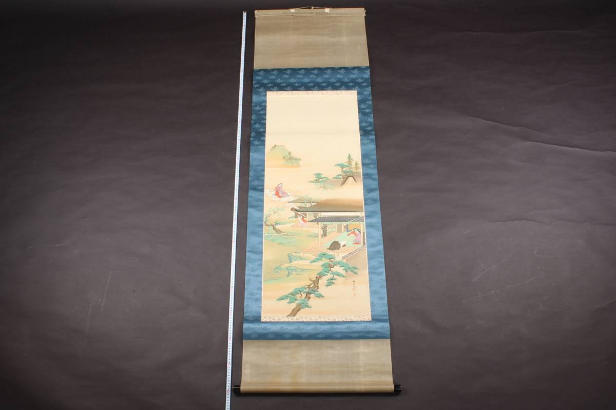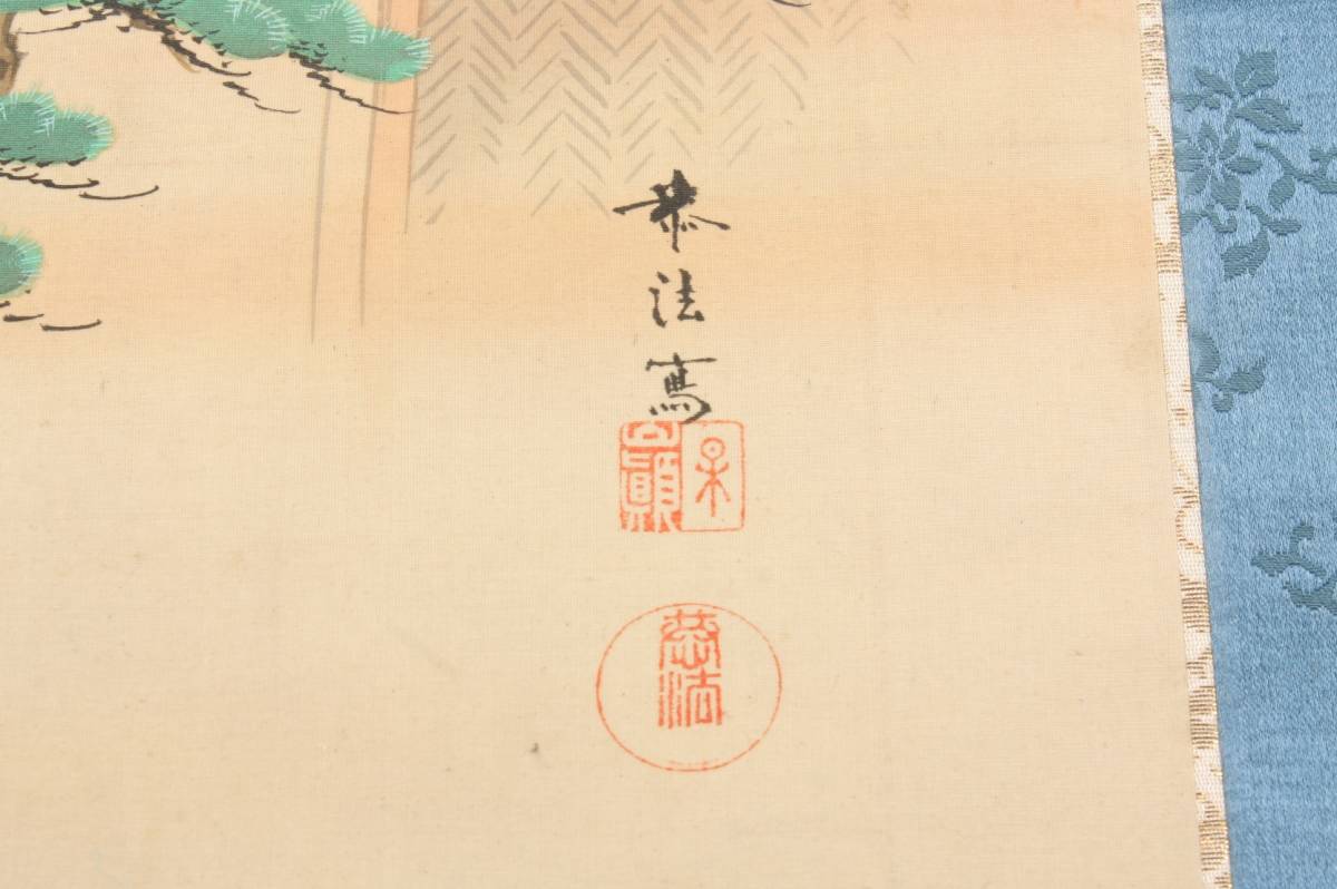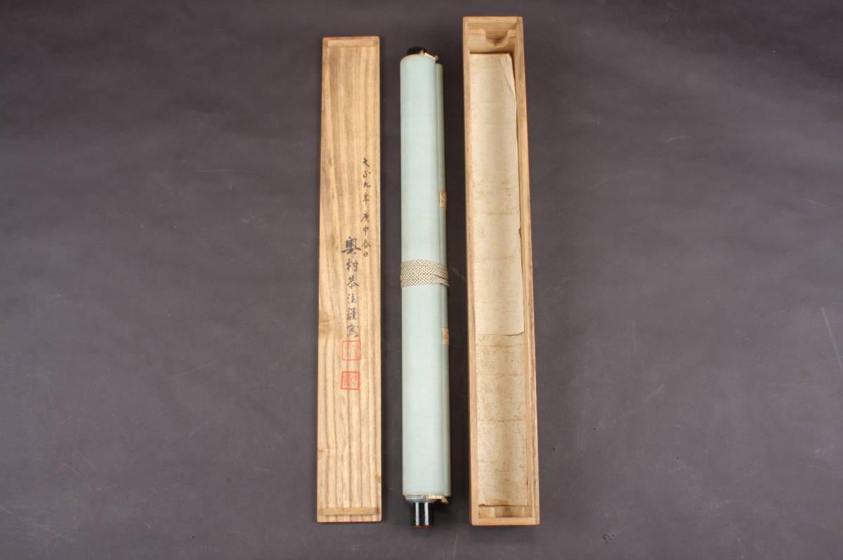 4285 大正9年 庚申春日 奥村恭法 写 布袋丸石山母子訣別之図 山水画 掛軸 190cmx55cm 共箱