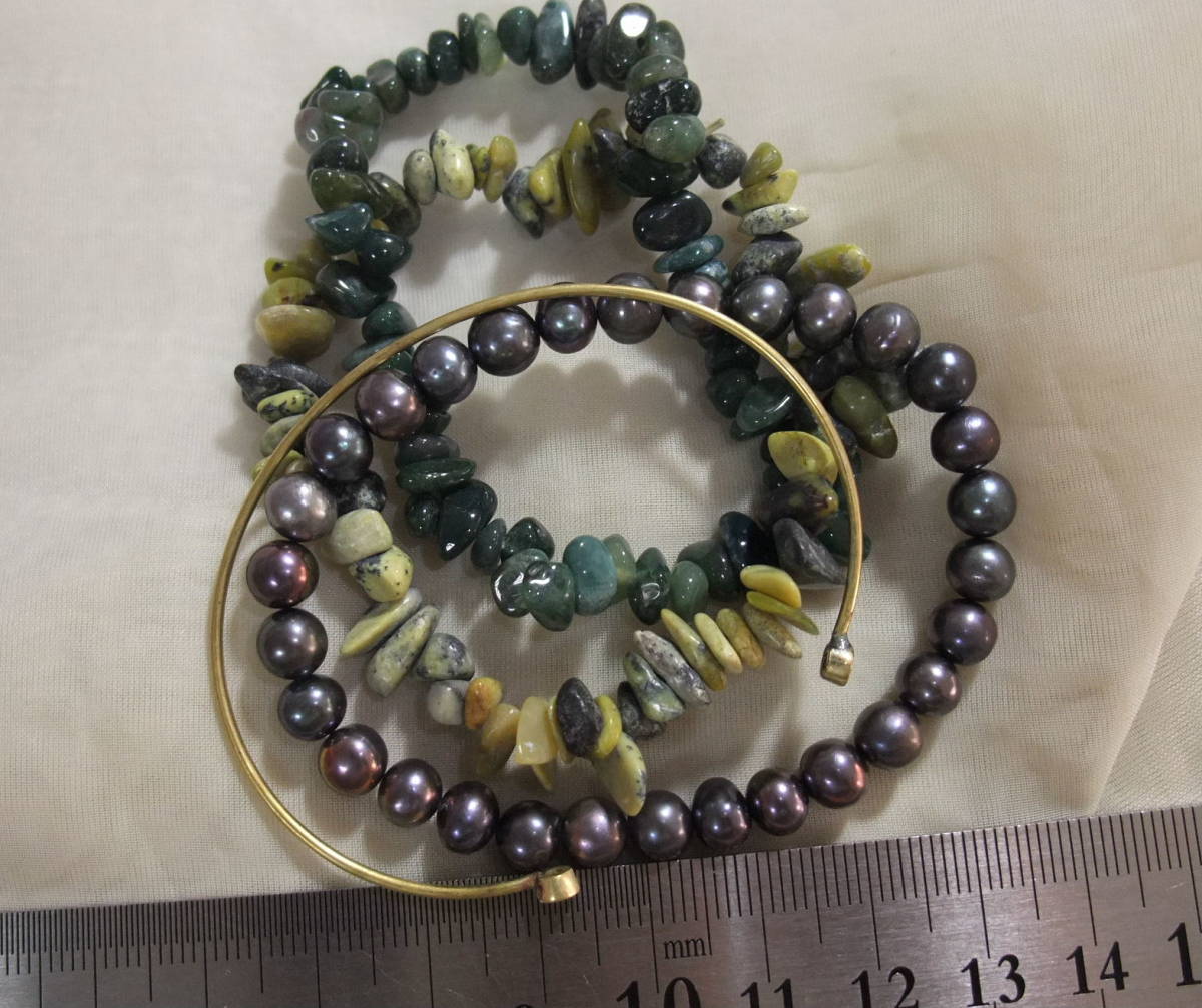 画像の、人気黒色の淡水パール、お値段高めのラウンドからセミラウンドバロックパールシェイプまでの、なかなか粒のそろった小粒から中粒のパール使用のシンプルなブレスレットと、オリーヴジェイドや瑪瑙等の天然石、そしてレトロなラインストーン付きの(ビンテージ系で経年感ありです)真鍮バングルの4本セットです☆
