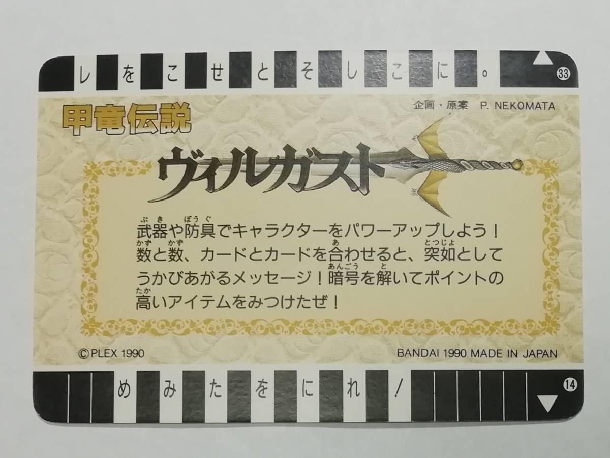 『ヴィルガスト』1990年 カードダス 甲竜伝説ヴィルガスト No.11 1枚です。■ガシャポン・ガチャガチャのミニカード、台紙など在庫有ります●【商品状態】ほぼ新品同様の品で、目立つ折れやハガレなどのイタミは有りませんが約30年前の紙製品で販売機からの購入品のため微イタミ微ヨゴレ微キズなどの可能性が有ります。細かな状態説明や状態評価を省略しましたので画像をご確認の上、状態質問などは「入札前」にしていただきご理解ご了承の上お買い求めください。※裏面に茶色のヨゴレ変色の場合が有ります。【リクエスト出品可能】多作品の1990~2000年頃のカードダス・PPカード類各種の在庫が多数有ります。お探しの品が有る方はQ&A欄よりお問い合わせください。※トレカはほぼ所有していません。※リクエストいただいた方のご購入をお約束するものではありません。