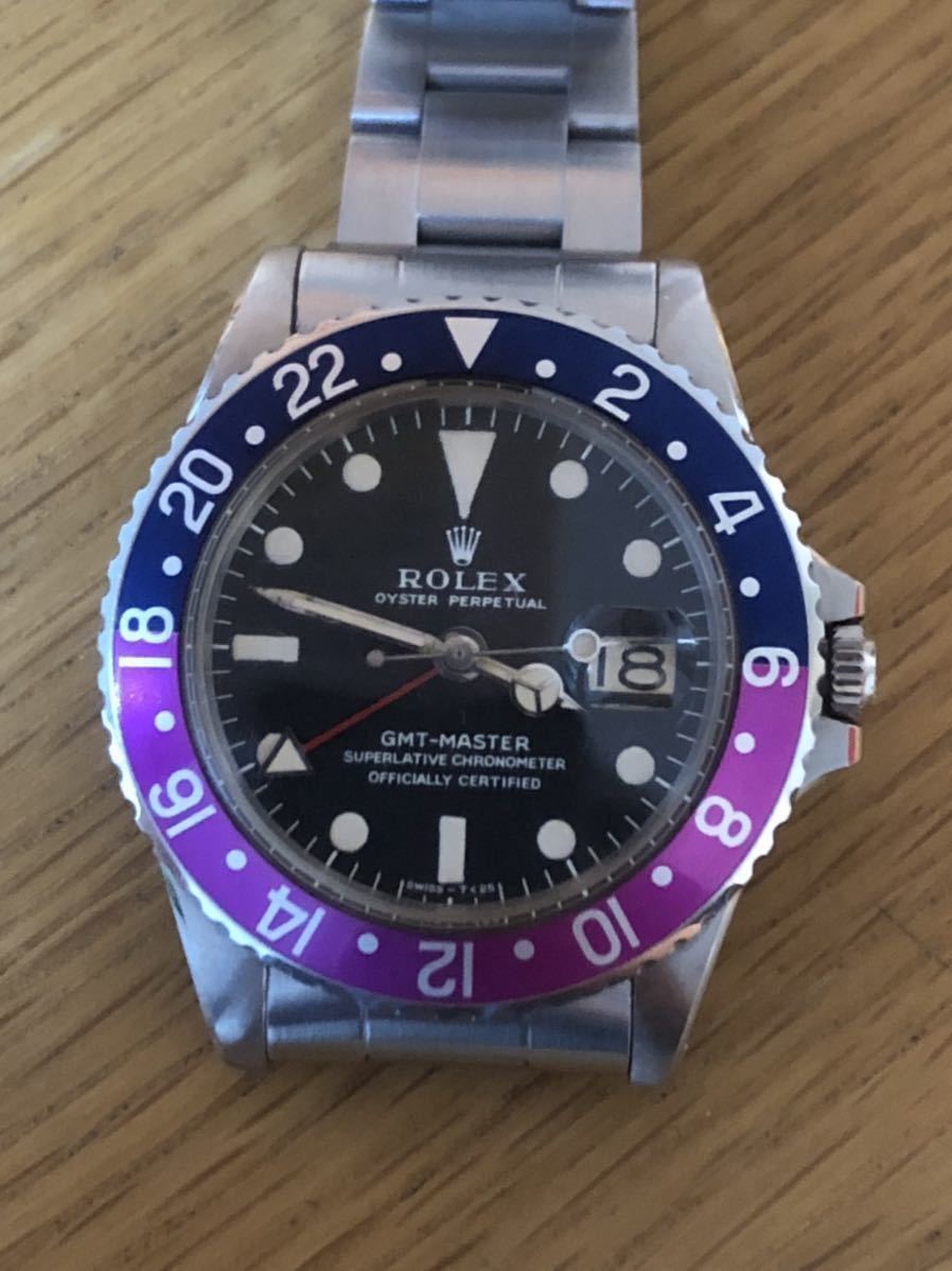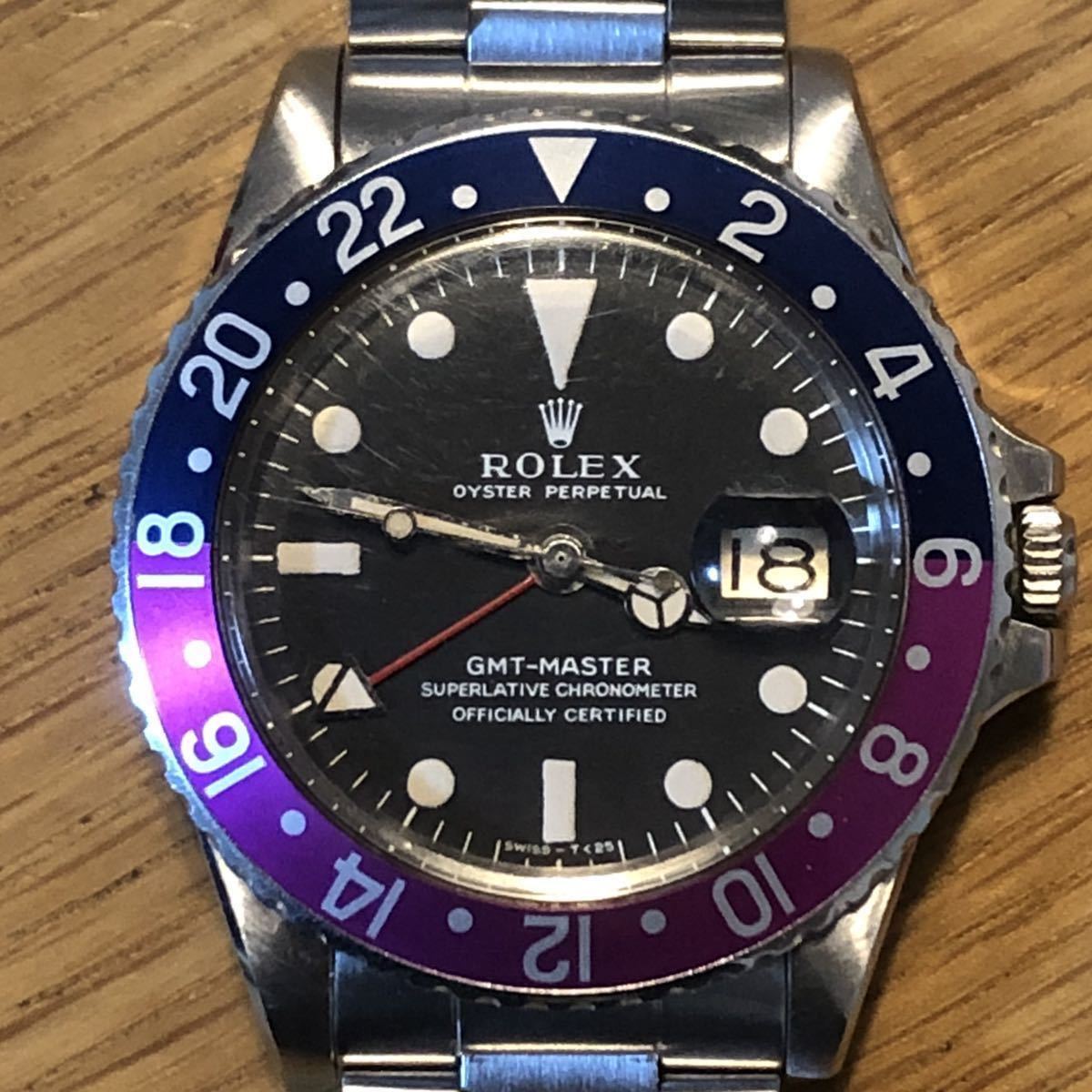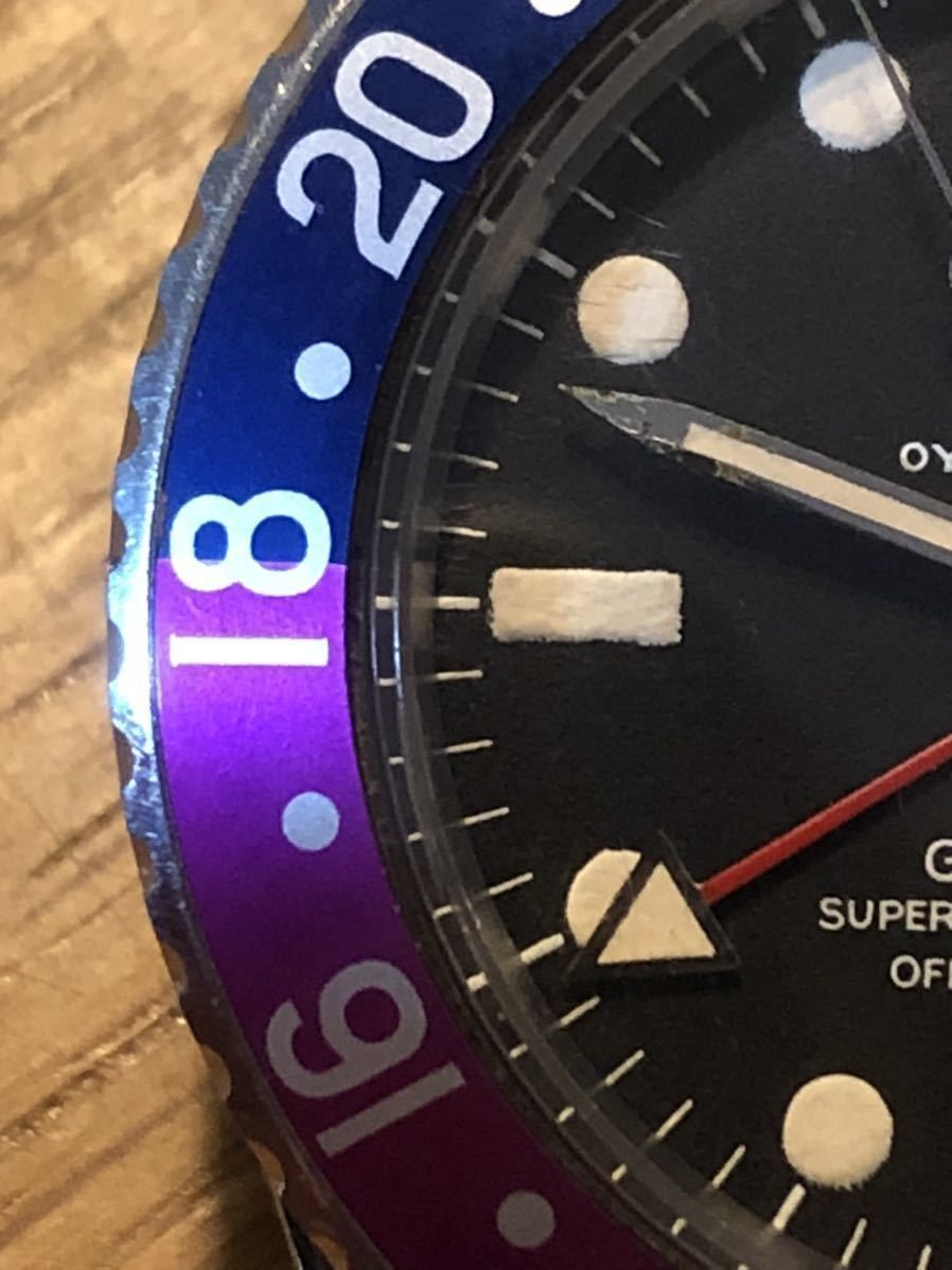 何よりも評価のポイントは、色濃いバイオレットベゼルです。ご興味ある方は色々調べてみてくださいませ。私も日々ネットや店頭にて逸品を探しておりますが、こうしたバイオレットベゼル(1型グレーチェンジダイヤル)などは、まず出てきません。おそらくお店側でもVIPへ一声で売れてしまうからでしょう。私も待ちに待ってようやくお声掛けいただき購入させていただきました。