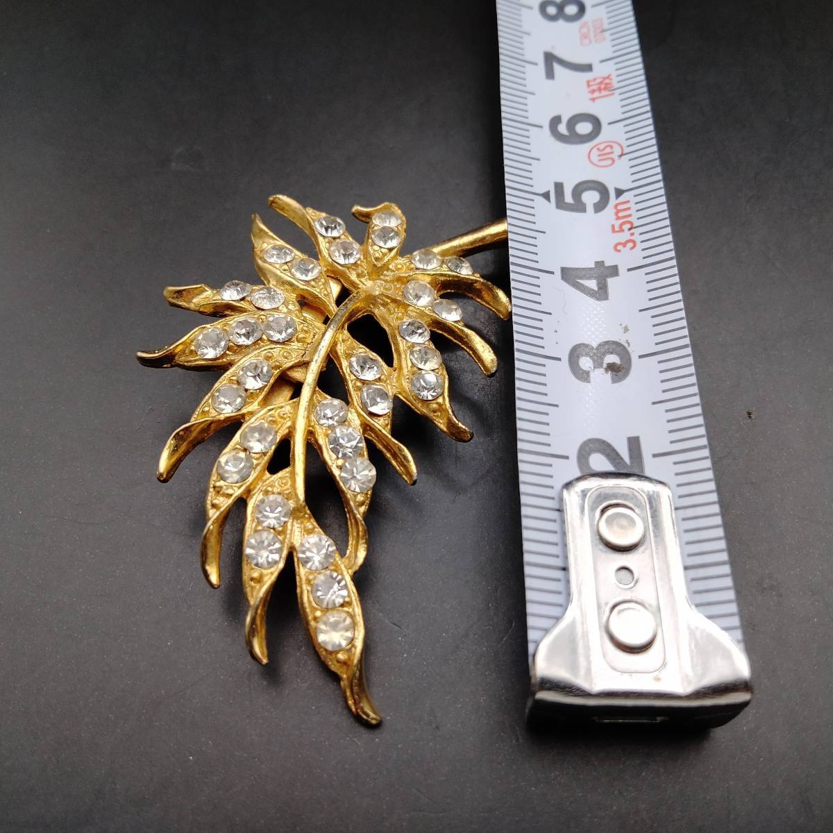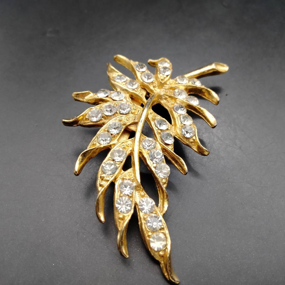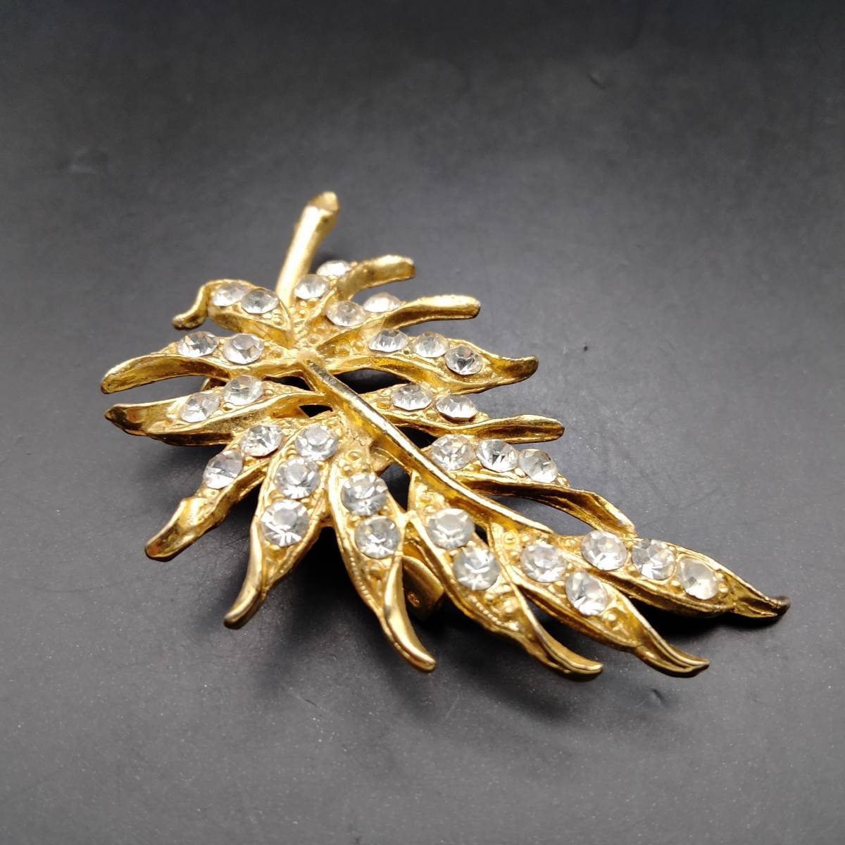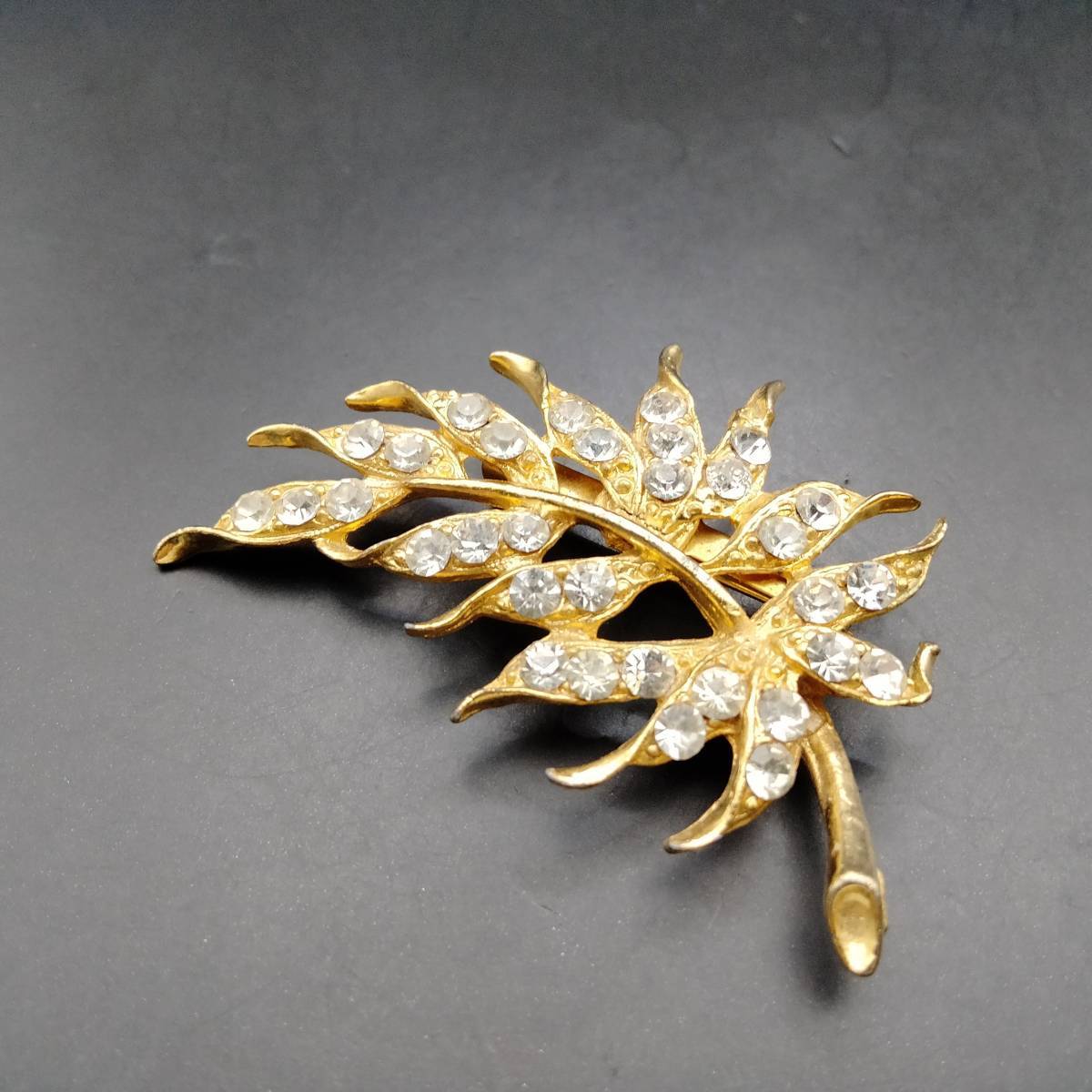 リーフ 葉 モチーフ クリア ラウンド ストーン ゴールドトーン ビンテージ ブローチ 昭和レトロ コスチューム ジュエリー 輸入 7S-E