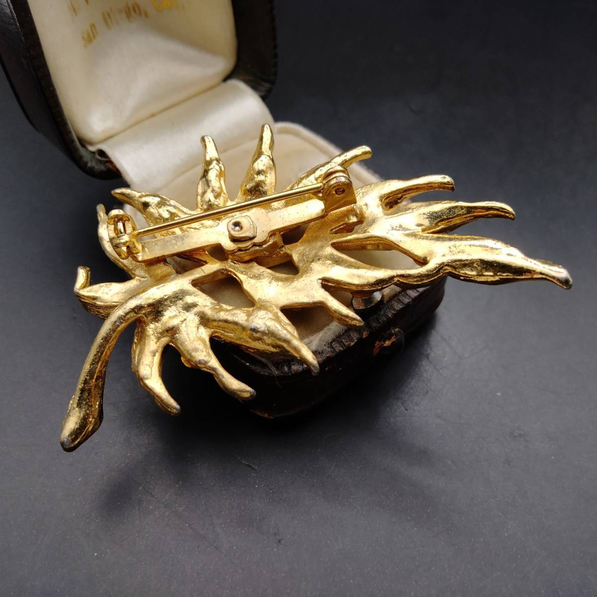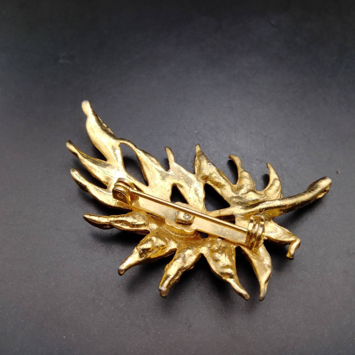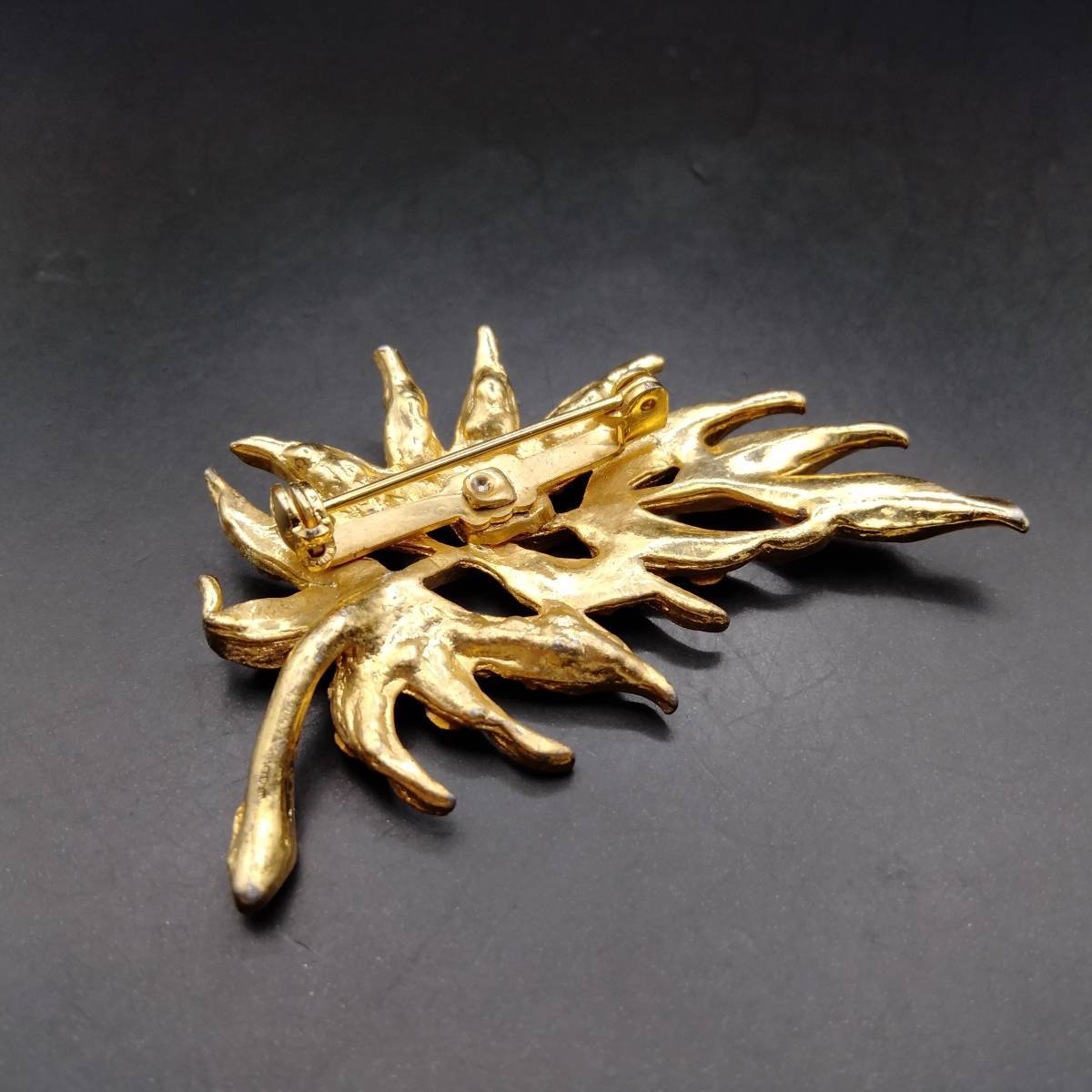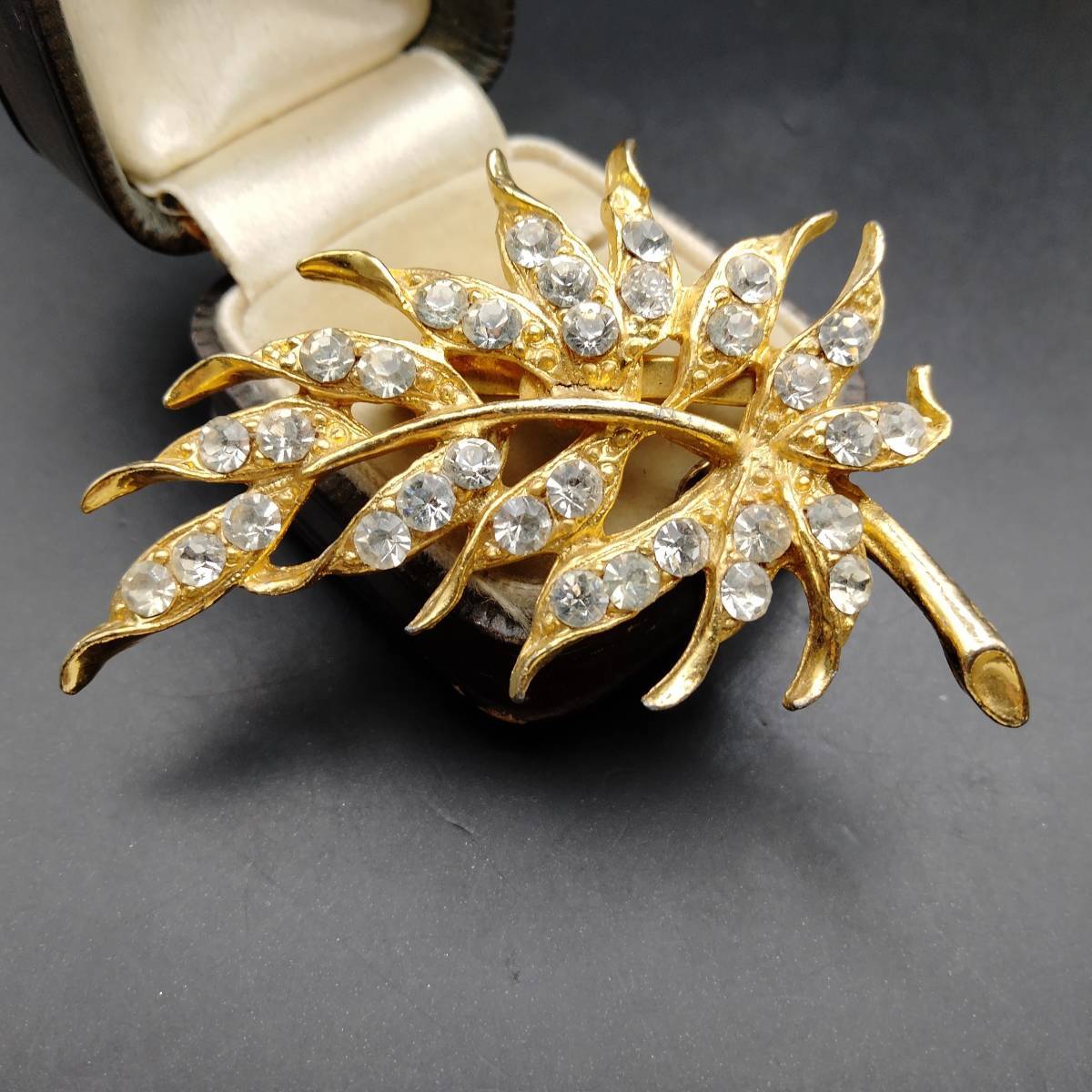 リーフ 葉 モチーフ クリア ラウンド ストーン ゴールドトーン ビンテージ ブローチ 昭和レトロ コスチューム ジュエリー 輸入 7S-E