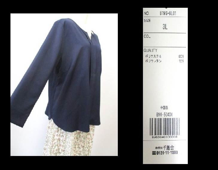 商品紹介 | ★表示サイズ…3L(バスト100-108 身長154-162) ★素材…ポリエステル85% ポリウレタン15% ★中国製 ★(株)千趣会 ★お色…ダークネイビー ・袖口4cmスリット入り ・重量…220g ★実寸(多少の誤差はご了承ください) 肩幅:40cm 身幅:57.5cm 袖丈:52.5cm ●土日祝日年末年始は発送できませんのでご了承ください。 ●画像の色合いは撮影環境、モニター環境により実物と若干異なる場合がございます。予めご了承ください。 まとめて取引は最初の落札から72時間が対象です。 最初の落札商品の取引ナビで同梱希望の旨をお知らせください |
