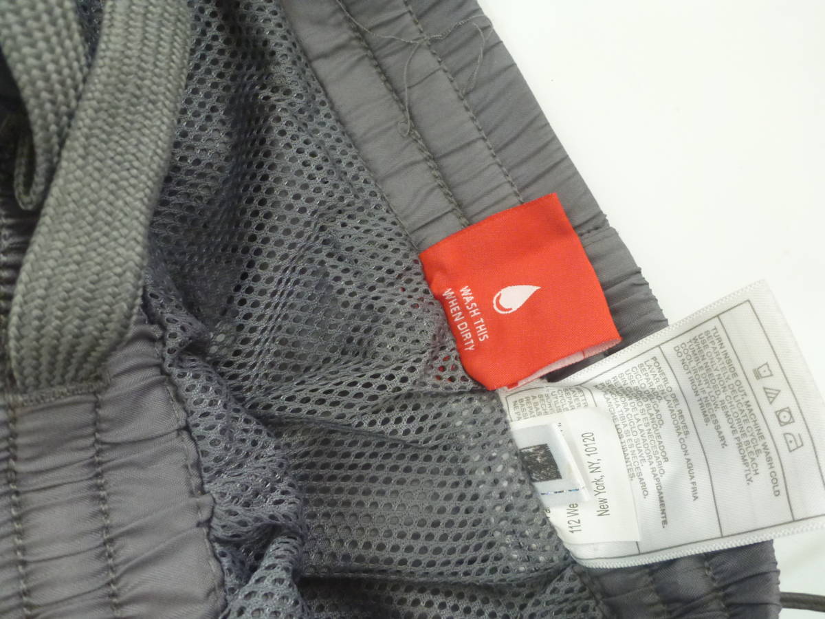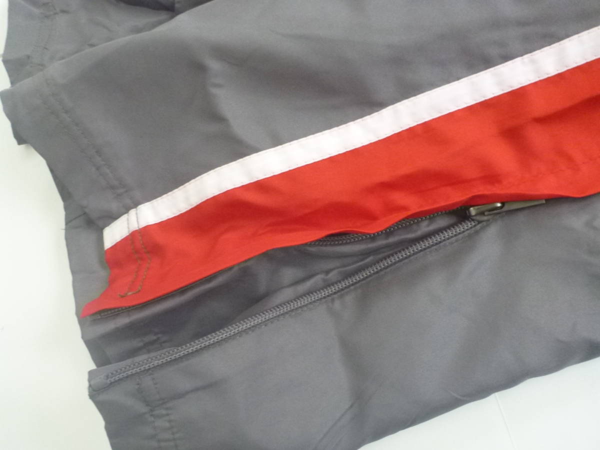 ◆グレー×白×赤 裏地メッシュ 裾ファースナー 両サイドポケット ジャージ パンツ ウエスト紐あり