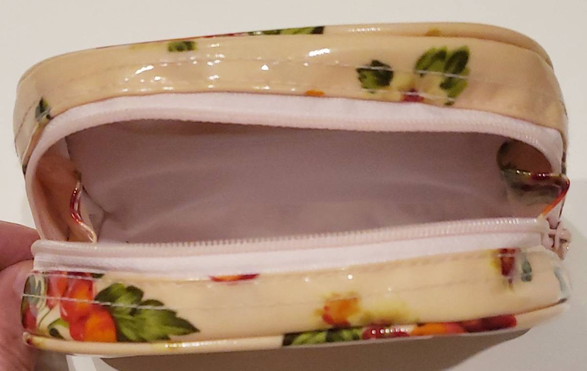 ビニール素材、縦10cm、横12cm、まち5cm。