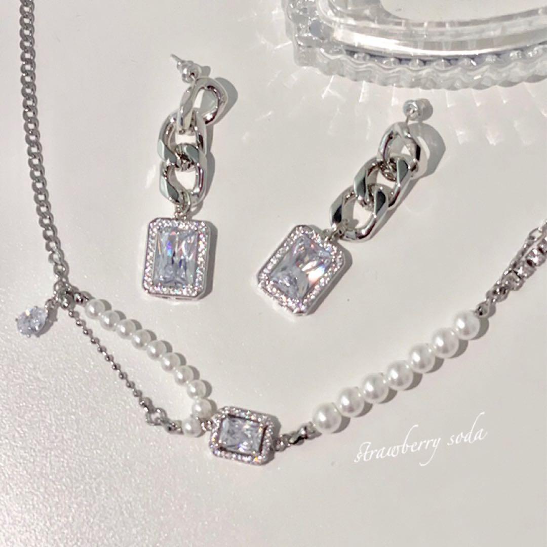 チェーン×スクエアビジューのクールなデザイン