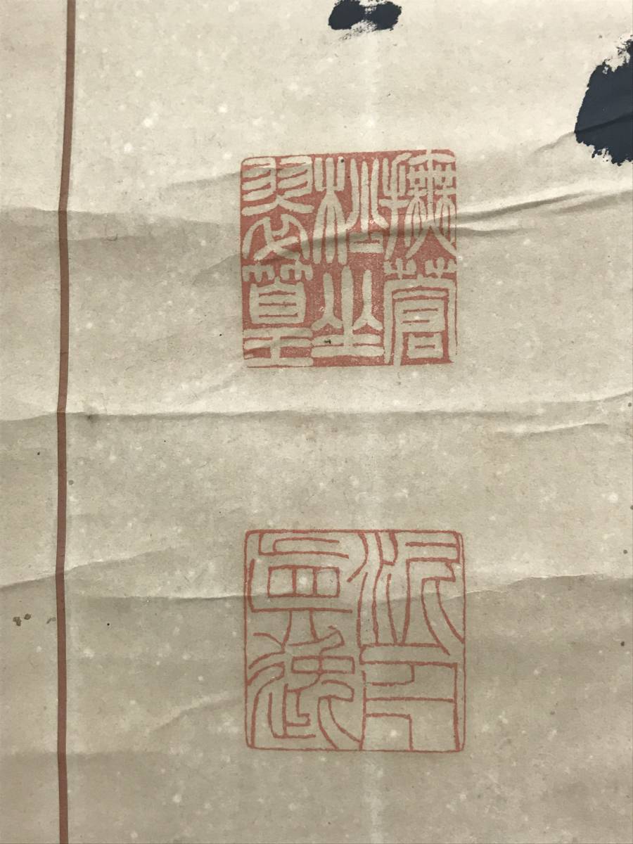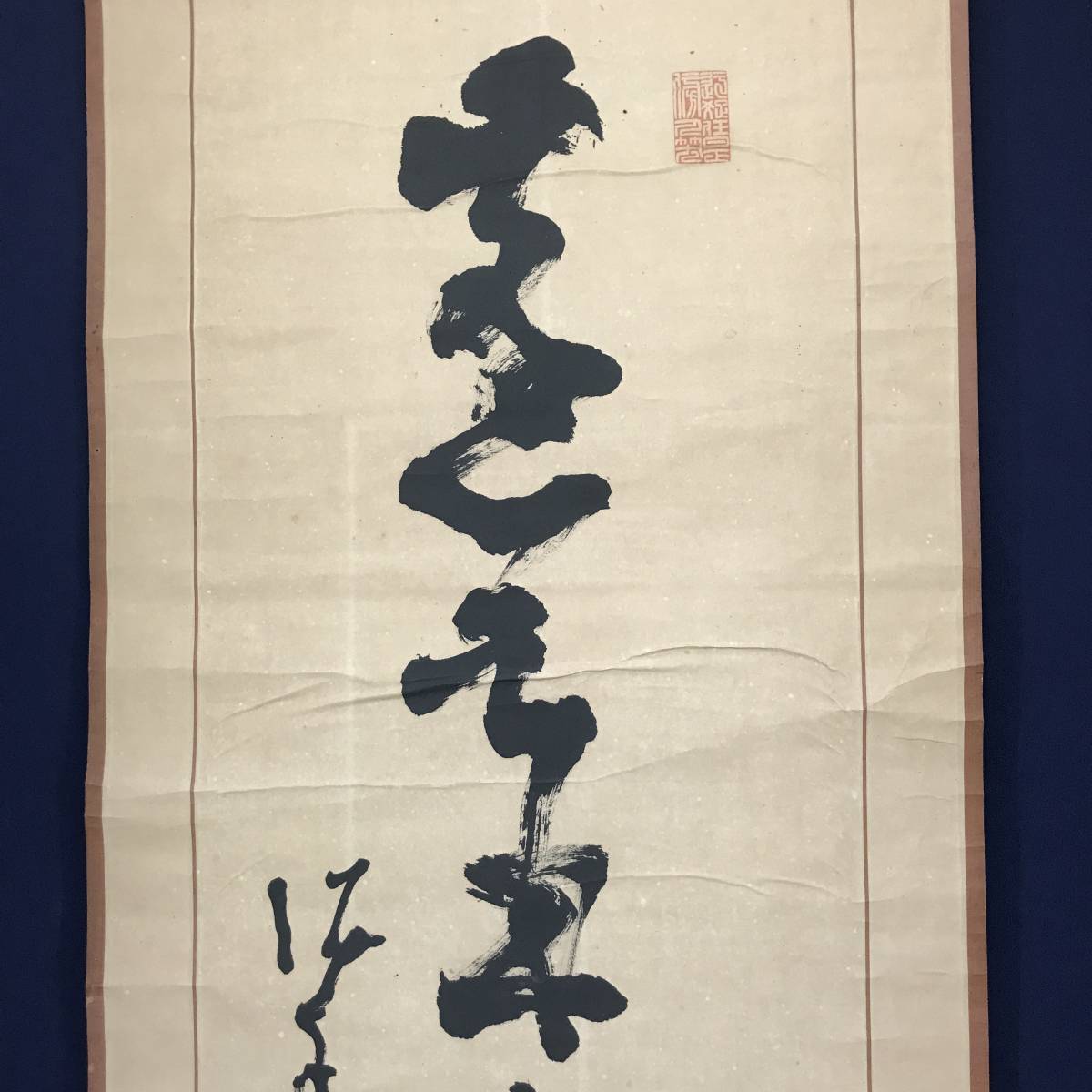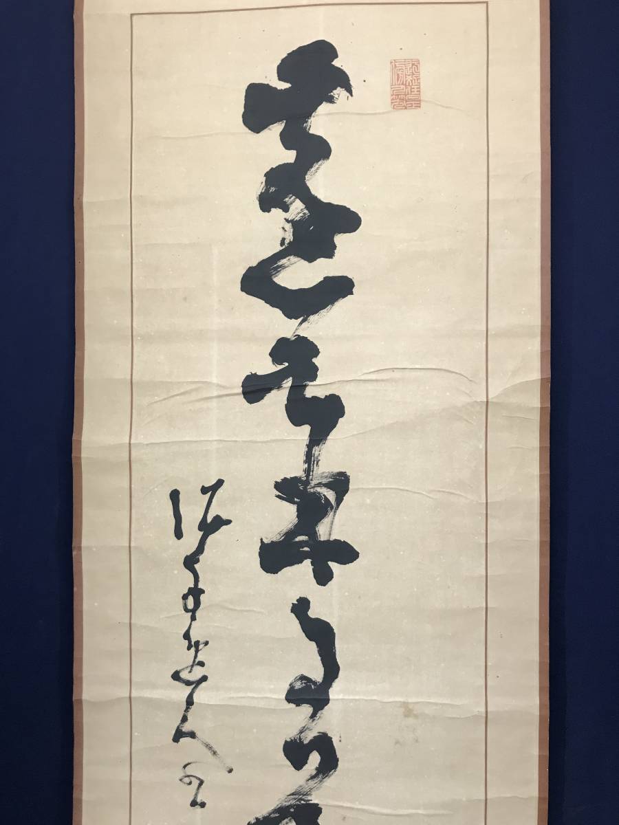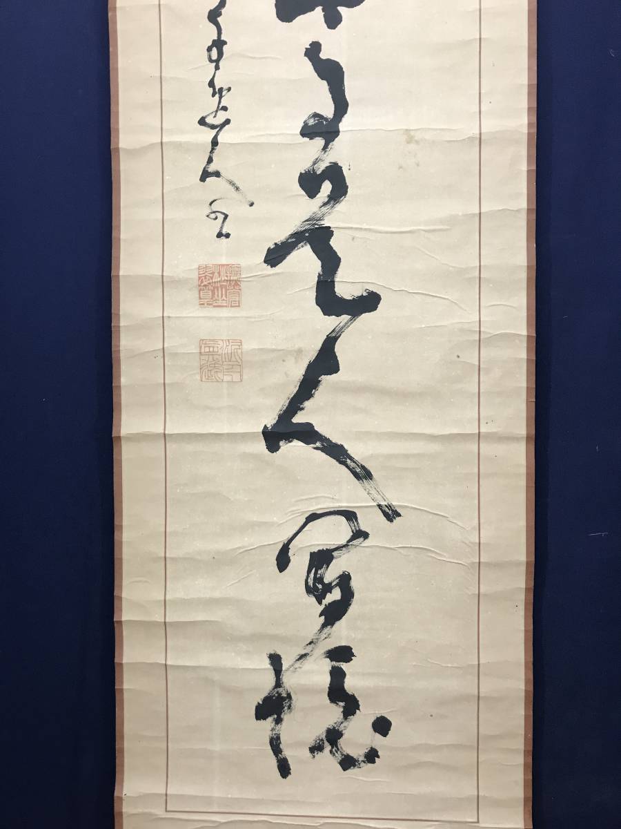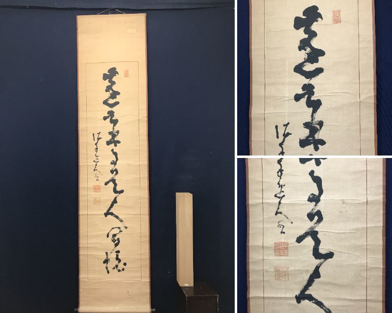 【作品状態】 本紙は紙本です。本紙肉筆で時代感あり、全体に汚れシミ、よく目立つ多数の浮きシワ、巻シワなどあります。 表装は紙表装で、時代感あり、多数の水シミ、浮きシワ、両端に数か所の欠損あります。
