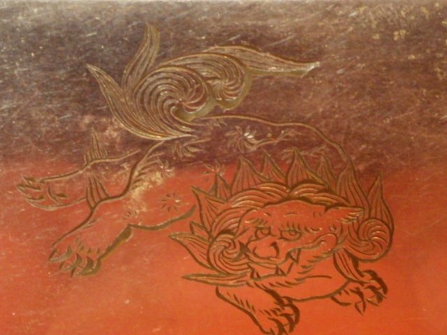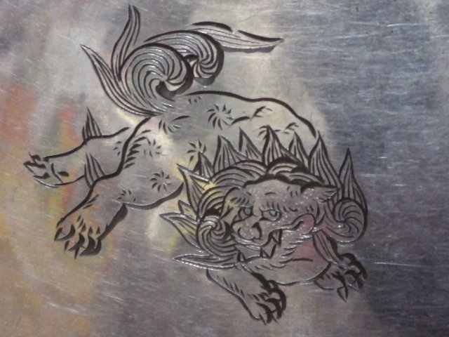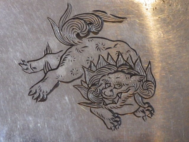 龍、虎、桜、沖縄地図、日本地図、コリアマップ、などの図柄が多く見られますが、こちらのお品は、魔除けの意味意味合いを持つ神獣、唐獅子の図柄が勇壮に描かれており、たいへん珍しくCOOLなお品となります♪