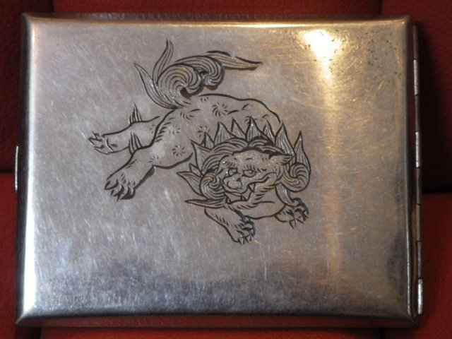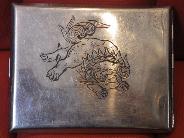 1945年以降の日本では占領軍兵用にスカジャン等、日本をイメージさせる図柄が入った数多くのスーベニアアイテムが作られており、アメリカ本国へ好んで持ち帰られておりました、こちらはその当時にアメリカに持ち帰られたシガレットケースの里帰り品になります♪