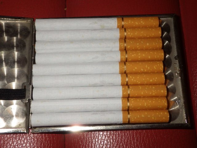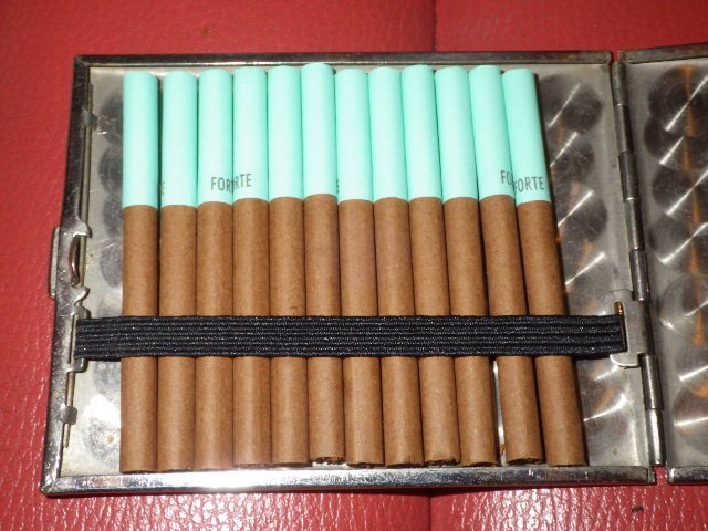 元々は、当時のショートタイプのタバコ用のケースですが、向きを変えると画像のようにロングタイプのものも収納可能です(1列収納可能なサイズになります)、ショートタイプのタバコはもちろん、最近は手巻きのタバコを愛用する方も増えておりますが、巻きタバコ用にもちょうど良いサイズ感です♪