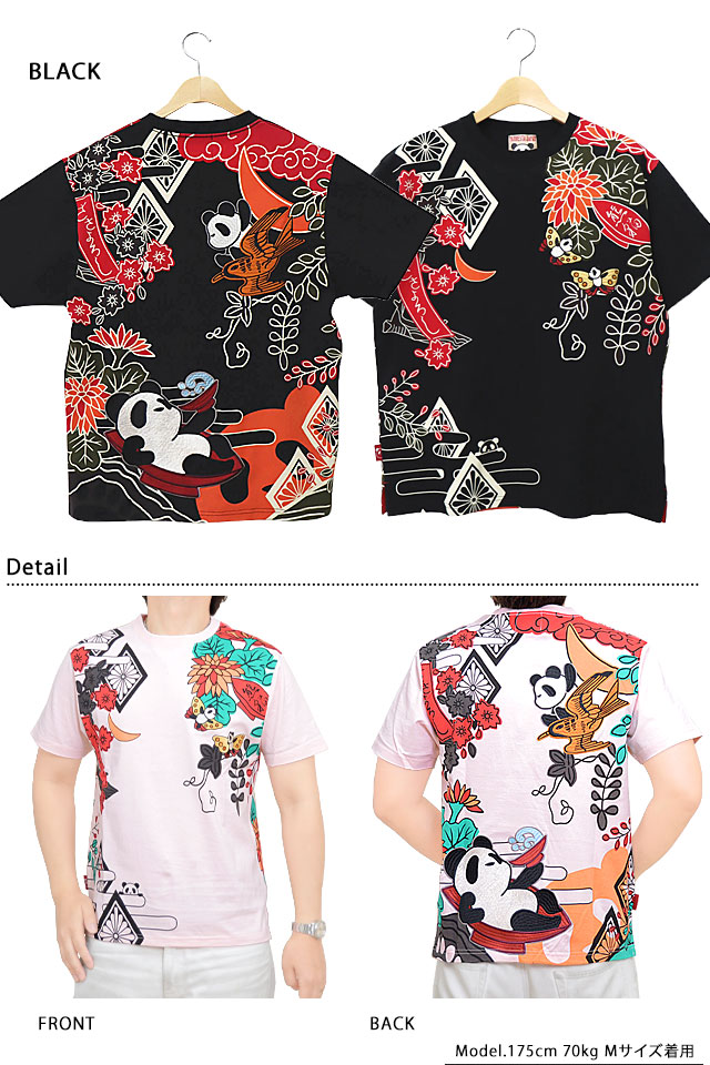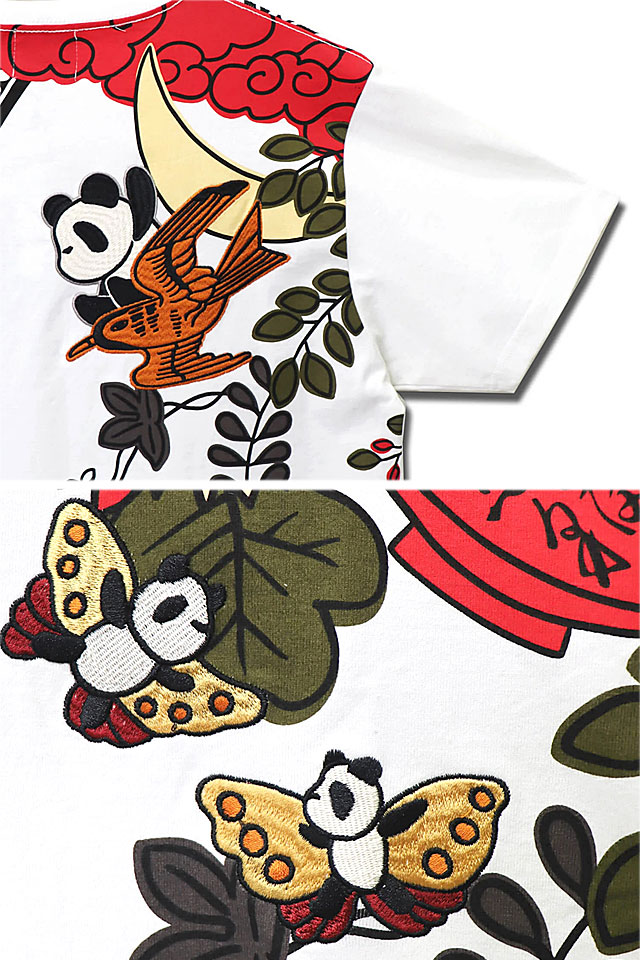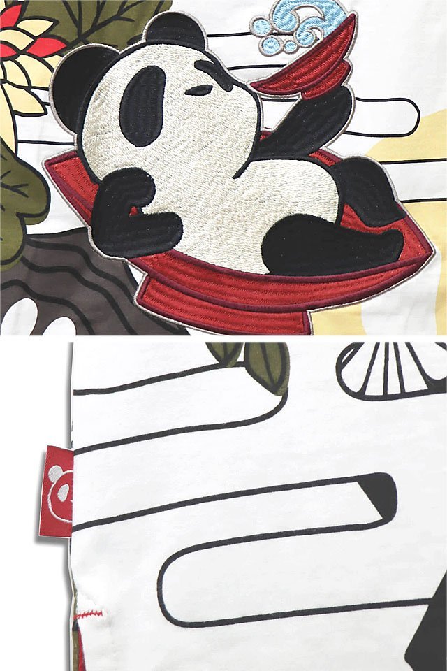 和柄ブランド【錦】の姉妹ブランドとして誕生した、お茶目なパンダをモチーフとした【PANDIESTA JAPAN】より「花札半袖Tシャツ(582215)」のご紹介です。 今や、錦の定番モチーフとなった「錦PANDA」!! 藤に不如帰、菊に盃などの花札とその中で優雅に寛ぐパンディエスタをモチーフとしたグラフィックTシャツになります。 荘厳な絵画の様なデザインは、一枚でのスタイリングがオススメ。 ブラックボディには着色抜染プリントを使用しており、ビンテージアイテムの様な雰囲気を演出したクオリティの高い一枚となります。 | |||||||||||||||||||||||||