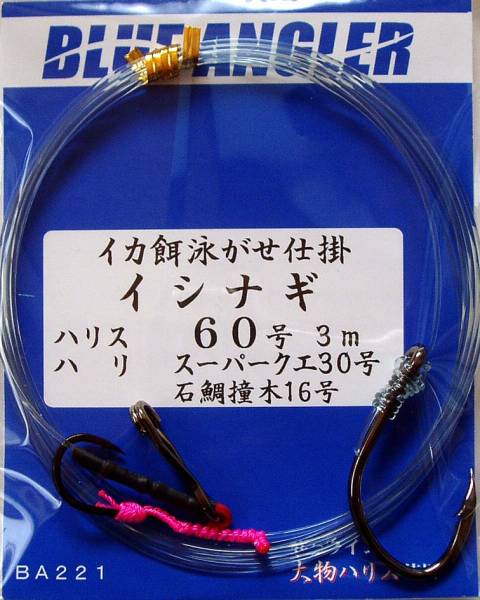 ブルーアングラー仕掛のご案内です。この仕掛は、初春~初夏のイカを餌にしてイシナギを狙う場合に使用します。餌にするイカの大きさが様々なので、孫針が遊動し、イカの大きさに合わせられる様になっています。★孫針は安易に動かない様にやや「きつめ」に取り付けて居ります。移動方法はパッケージ裏面の説明をご覧下さい。★品名:イカエサイシナギ60号★ハリス:ナイロン60号3m、サンライン大物ハリス使用。★ハリ:親針 オーナースーパークエ30号、孫針(遊動式)石鯛撞木16号★親針は坂本結び、孫針はピンク糸にて編み付け遊動式。サルカンはロックスナップ(ダブルスリーブ止め)です。★泳がせ用先糸もしくは泳がせ用リーダーシステム(別売)と合せてご使用下さい。★発送:郵便局のクリックポストでお送り致します。★送料:全国一律185円。複数でも送料は185円です。★このオークションは、入札した時点で落札出来る即決価格にて出品しております。★他にも出品しておりますので、是非ご覧下さい。★出張等によりご連絡や発送等が出来ない場合のご連絡事項等は、自己紹介欄に記載致しますので、一度こちらをご覧下さいます様お願い致します。★以上よろしくお願い致します。