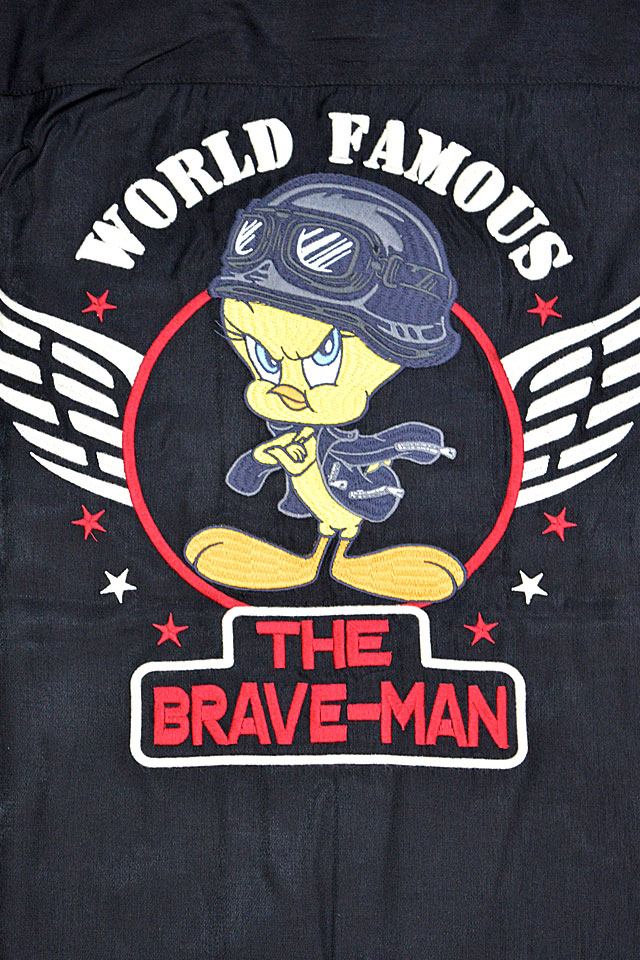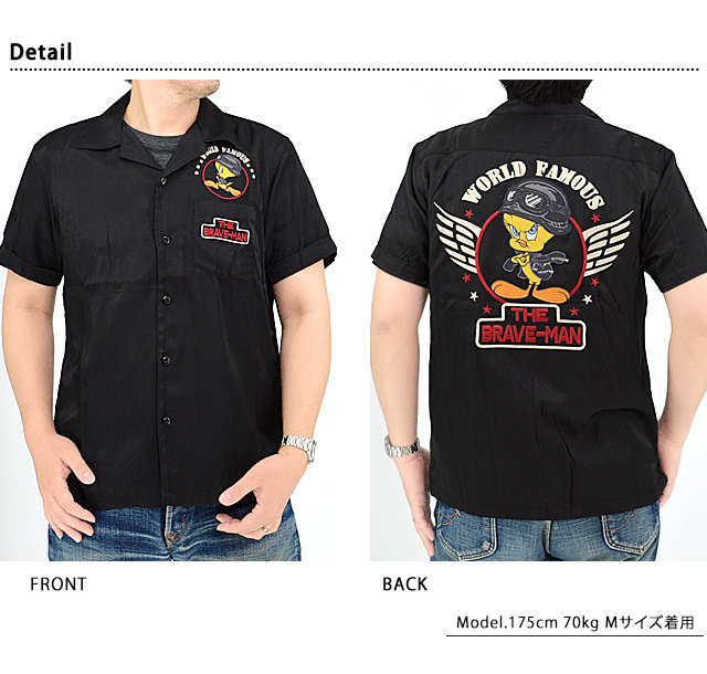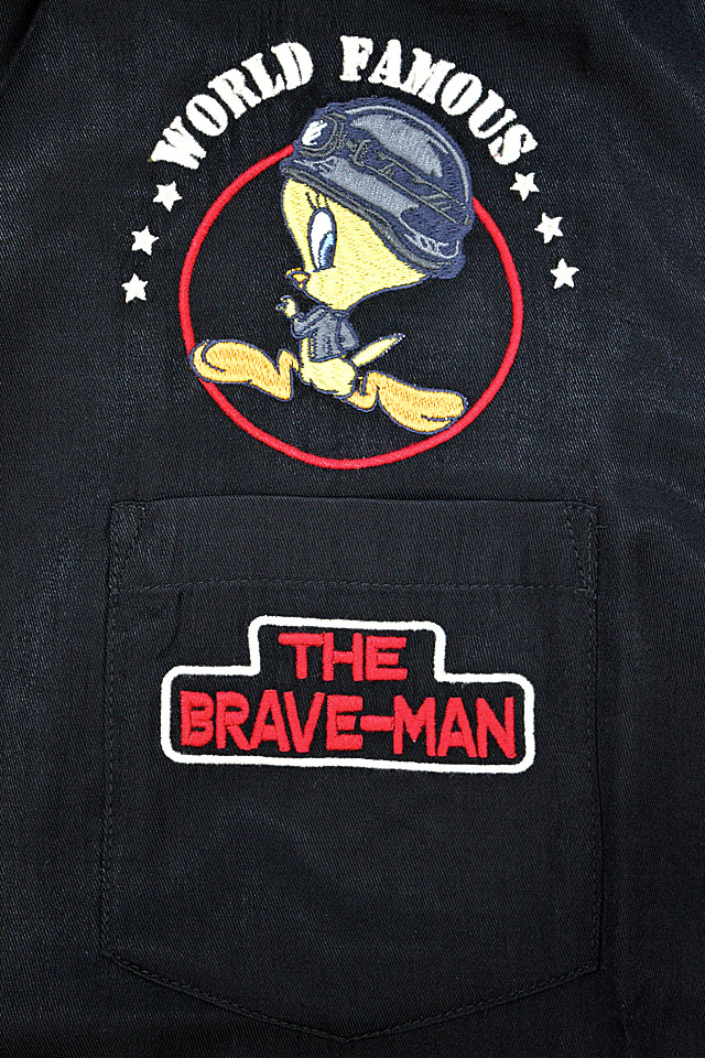 1920年代~40年代にアメリカでワークウェアを中心とした製品を世に送り出したブランド「The BRAVE-MAN」から「BR×LOONEYコラボ レーヨン半袖シャツ (LTB-2310)」のご紹介です。 アメリカのワーナーブラザーズが製作するアニメーション【LOONEYTUNES】の人気キャラクターをモチーフにしました! 今回のデザインの主役は、可愛らしい外見からは想像出来ない腹黒さを持つカナリアのキャラクター【トゥイーティー】です。 背中には肩にレザージャケットを引っ掛け、ゴーグル付きのヘルメットを着用したトゥイーティーの立ち姿が刺繍で描かれています。 フロント左胸のポケットにはブランドロゴを、ポケット上にはトゥイーティーの刺繍ワッペンを配置しました。 ボディーには、てろんとした肌触りのレーヨン生地を採用。 カジュアルに着こなしに取り入れることの出来る、大人のキャラクターアイテムです。 | |||||||||||||||||||||||||