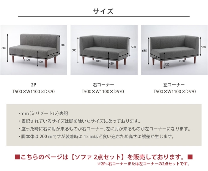 | [2P]約幅112×奥行58×高さ50cm [右コーナー]約幅112×奥行58×高さ50cm [左コーナー]約幅112×奥行58×高さ50cm |