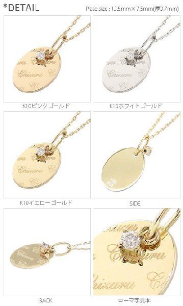 商品コード 2010070901 発送は2週間ほどです大切な人のお名前やご自分のお名前、大切にしている言葉、伝えたい一言ローマ字(筆記体のみ)・数字・?・&から2~10文字内で刻印出来ます文字の最初は必ず大文字、その他は必ず小文字になります文字の書体・大きさは変更できませんまた、製作に入りますと文字の変更や修正が出来ませんのでご注文時、また当店よりのご注文確認メールをご確認ください尚、コチラの商品では≪代金引換≫がご利用できません■商品詳細材質 k10ゴールド (ホワイト・ピンク・イエローよりお選びいただけます)ルース 天然ダイヤモンド 計0.01ct大きさ トップ最大幅 タテ 約13.5mm ヨコ約7.5mm(最大厚 約0.7mm)チェーン k10ゴールド /アズキチェーン(アジャスター管付) 40cm※チェーンのお色はトップと同色となります備考 材質・石目(ダイヤ)の刻印入り/チェーン・トップより取り外し可kuhinosaお誕生日 プレゼント 結婚記念日 クリスマス プレゼント ホワイトデー 結婚式 卒業式 入学式 新生活 母の日 成人のお祝い 女性への贈り物自分へのご褒美 浴衣に似合う ボーナス 夏 ポイント消化 ハロウィン 安い
