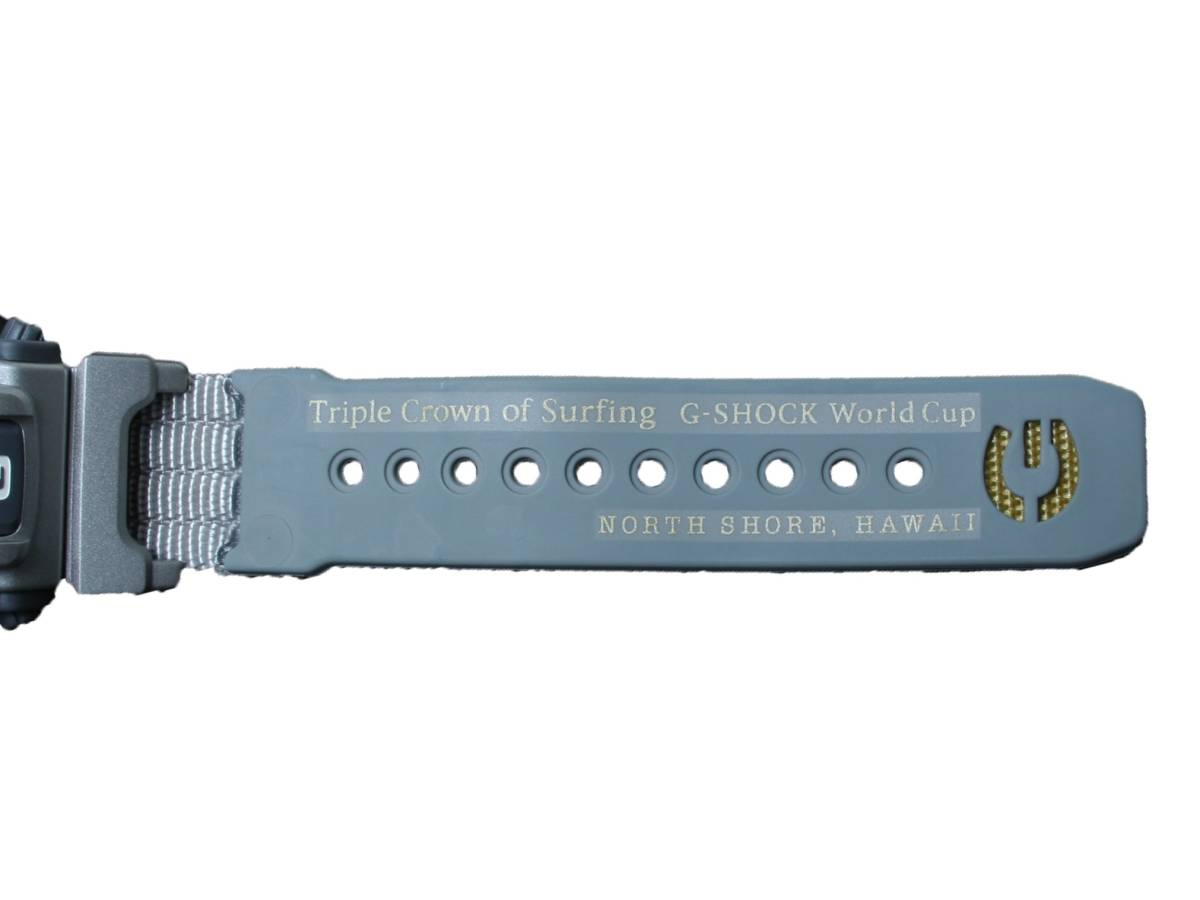 裏蓋と遊環には、世界の頂点に立つ王冠を表したTriple Crown of Surfing G-SHOCK World Cupのオフィシャルマークを、ベルトにはこの大会名称と、開催地であるNORTH SHORE, HAWAIIの文字を配しました。オートライトEL、フロントボタンスタートのサーフィンタイマーを搭載しています。