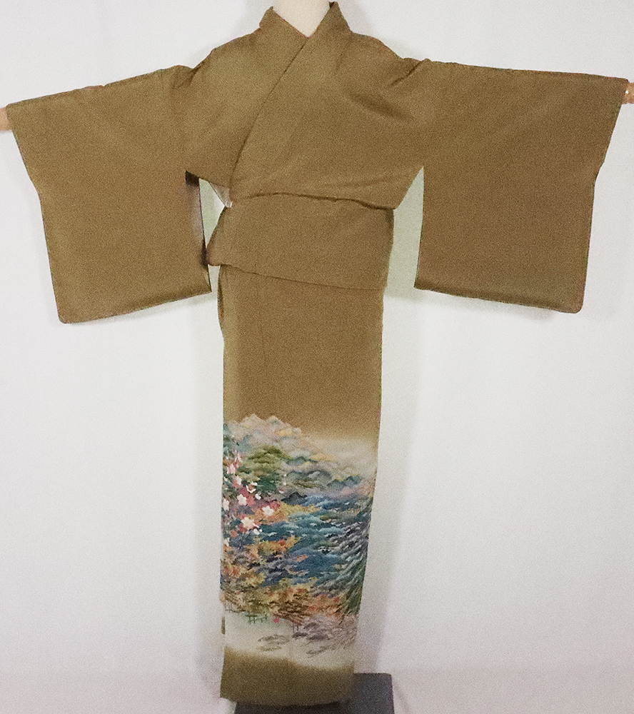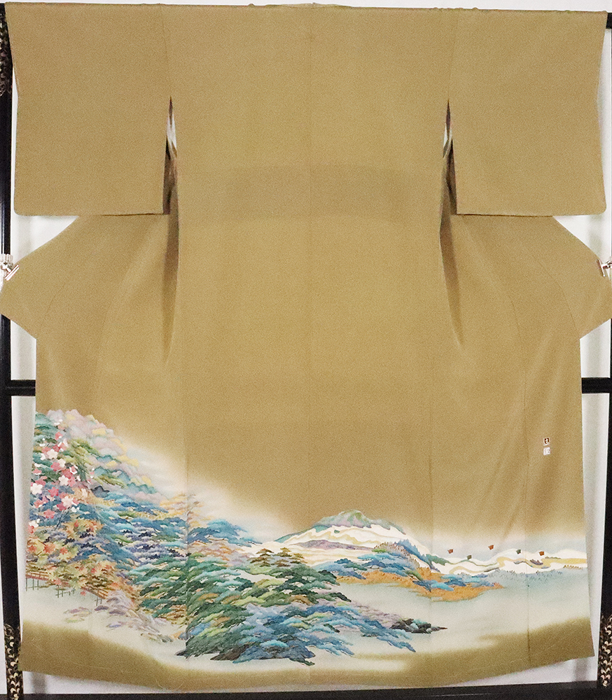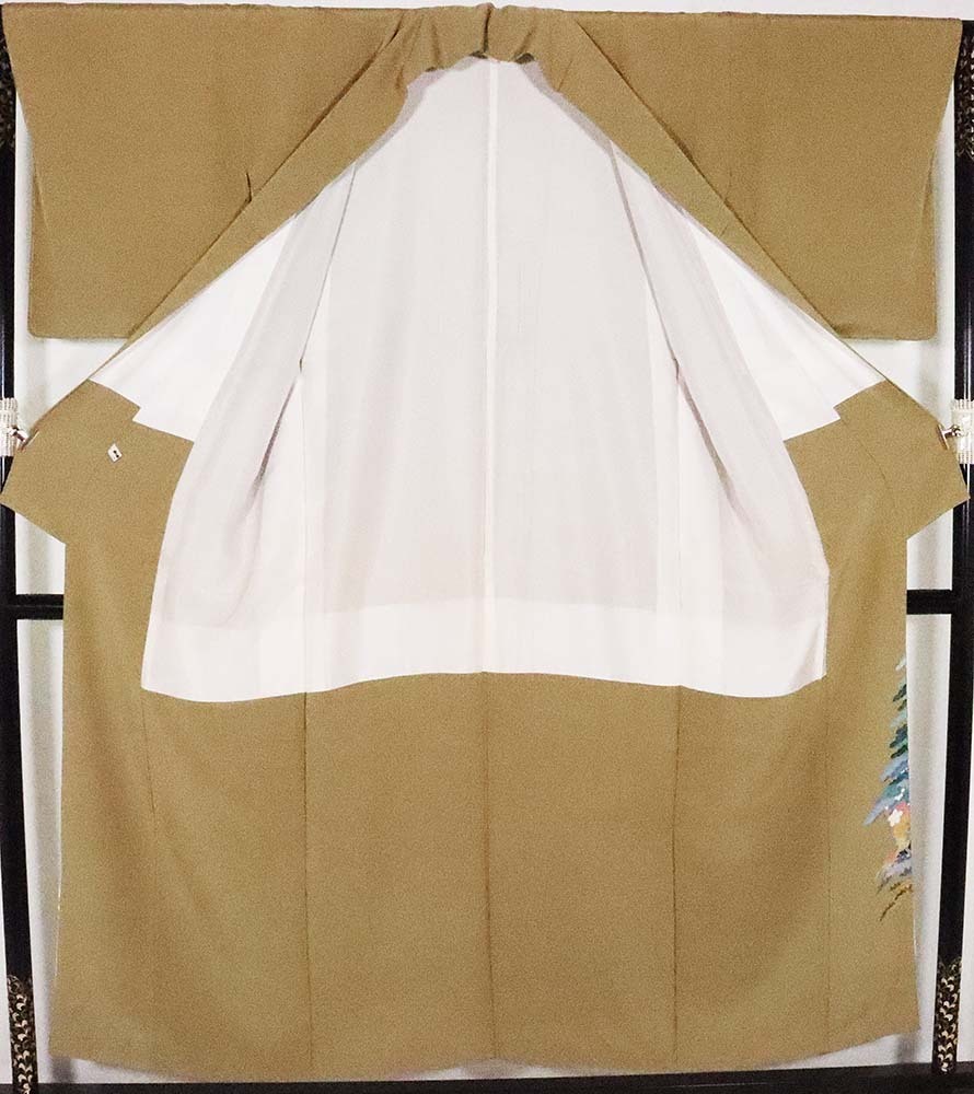 京加賀友禅 松本健一氏作 色留袖 袷 丹後縮緬地 抹茶色ぼかし地松竹梅 160 広襟 作家落款入り 一つ紋 未使用品 仕付け付き | |