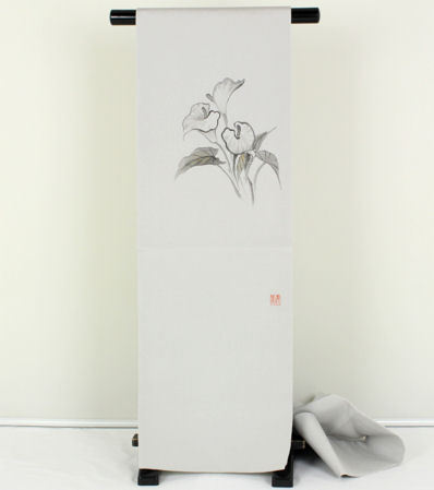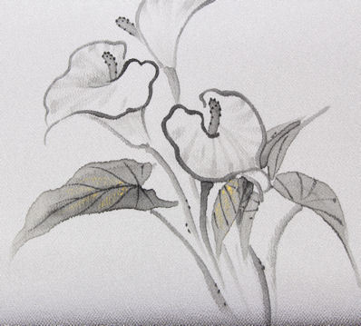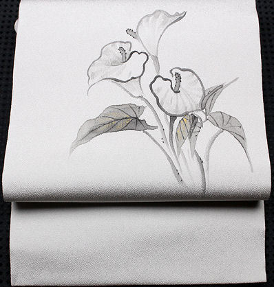 | 西陣織 縮緬名古屋帯 薄グレー地手描き友禅カラー 新品 作家落款入り 仕立て上がり | |