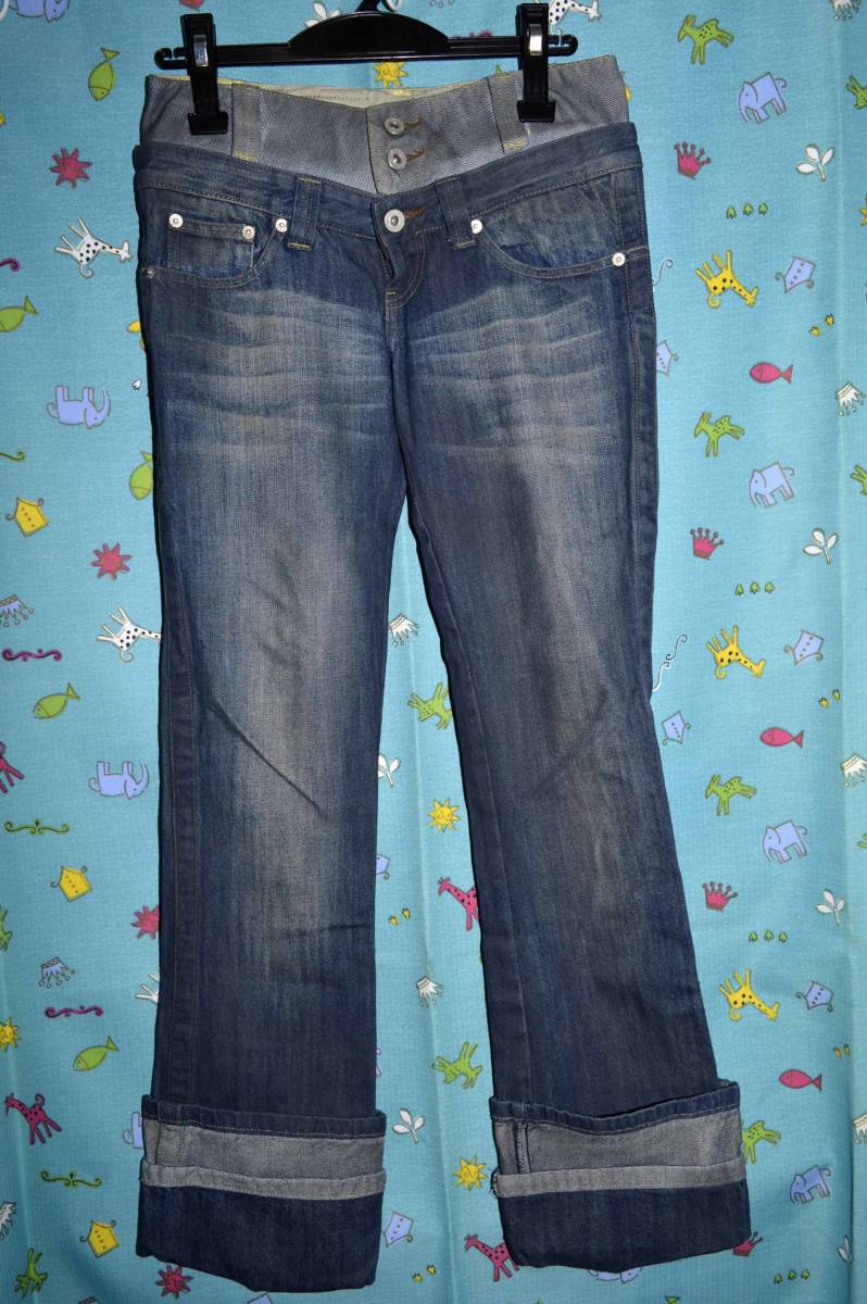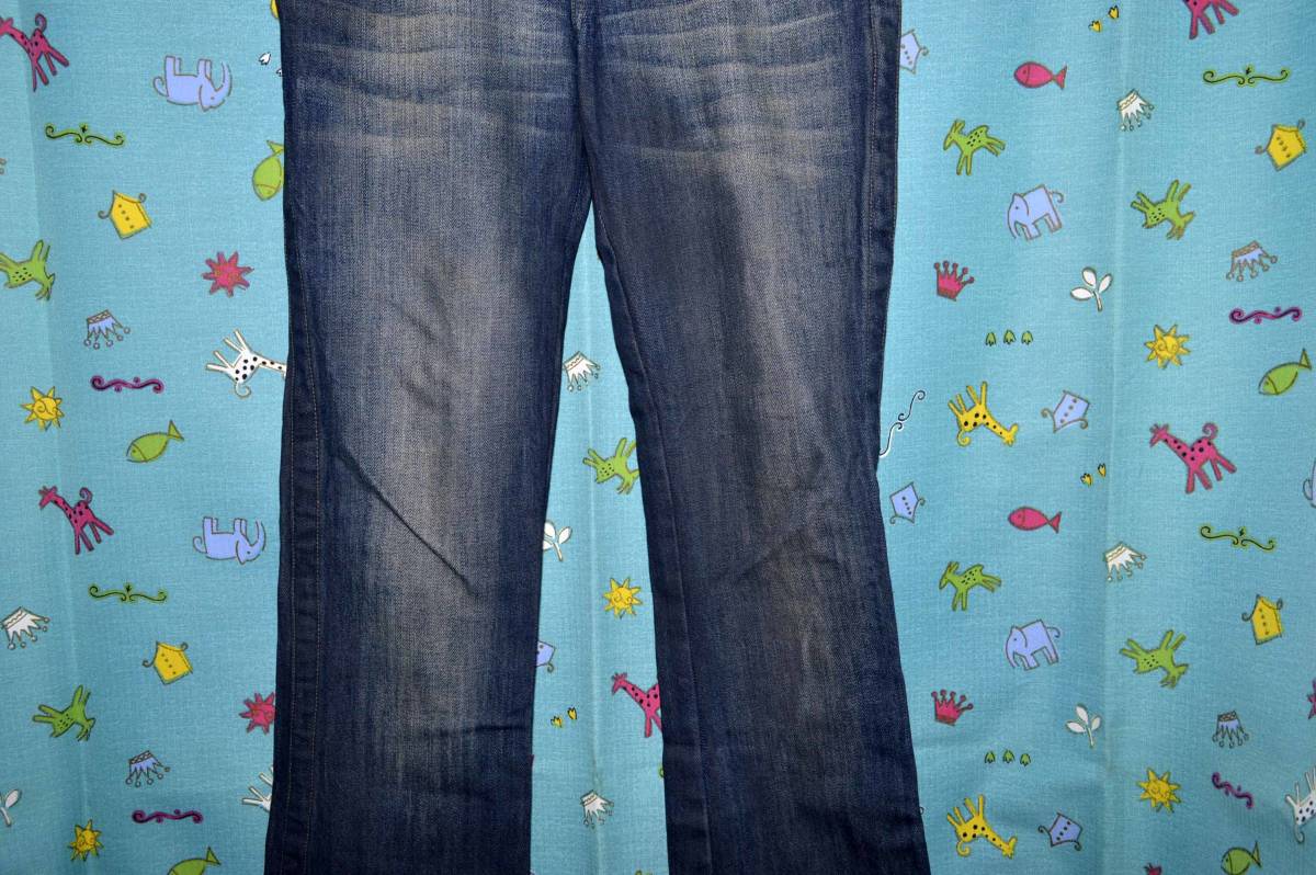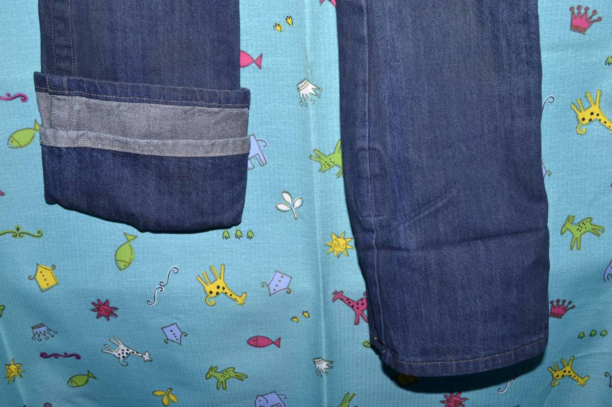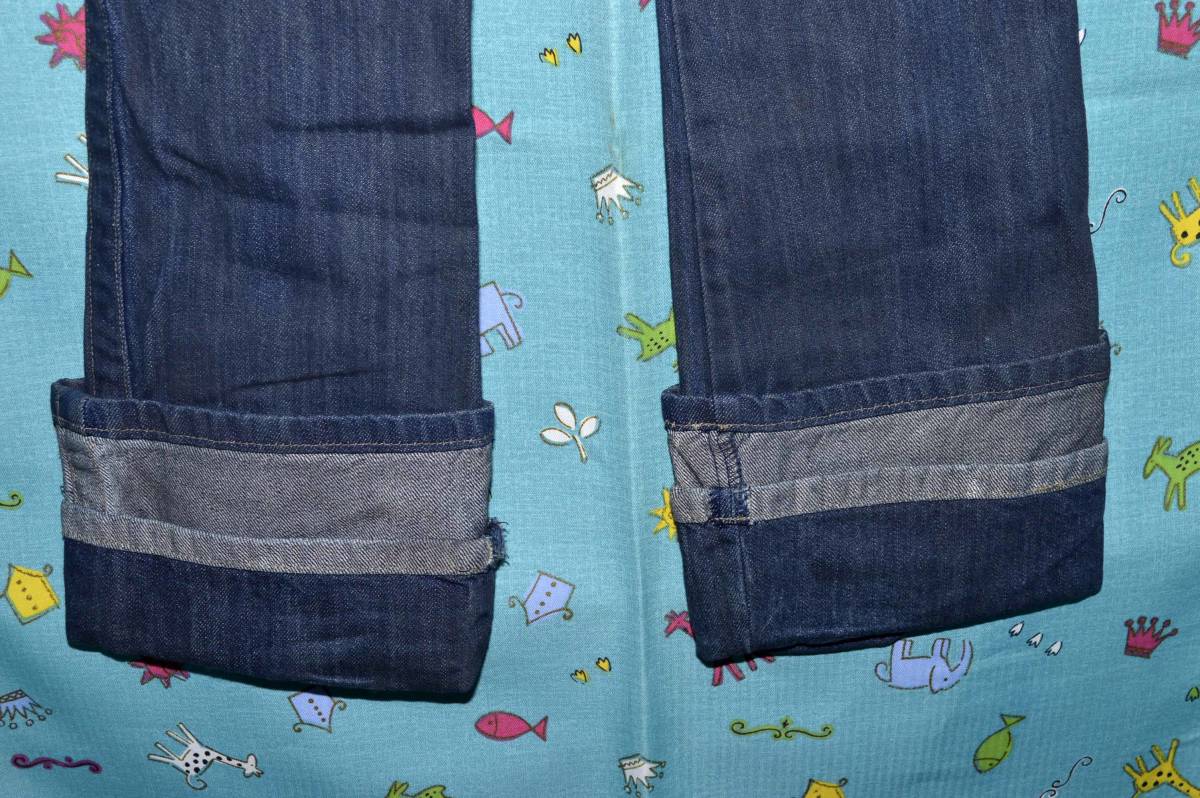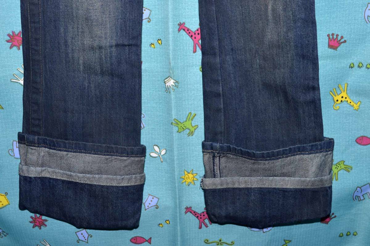平置き計測で、ウエスト37㎝、ヒップ48㎝、前股上21㎝、股下75(折り返し時)~88㎝、渡り幅26㎝、裾幅21㎝ です。
