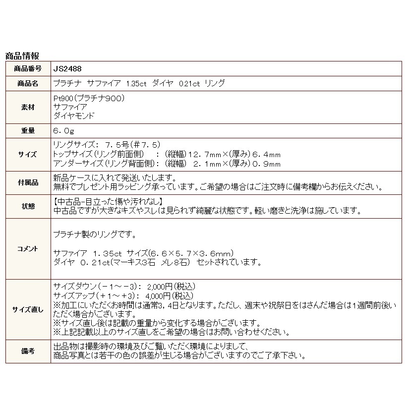 | 素材 | Pt900(プラチナ900) サファイア ダイヤモンド |