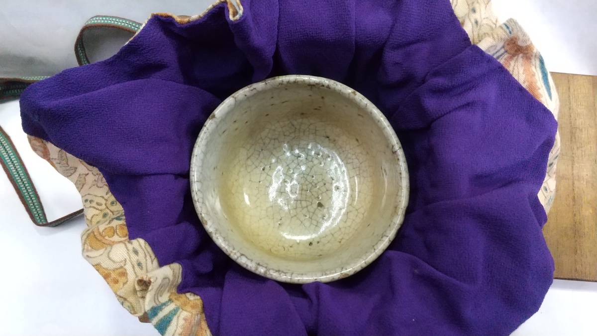 使い込んでいる『萩茶碗』ですねぇ。時代箱に入っていて、時代布に包んであります。