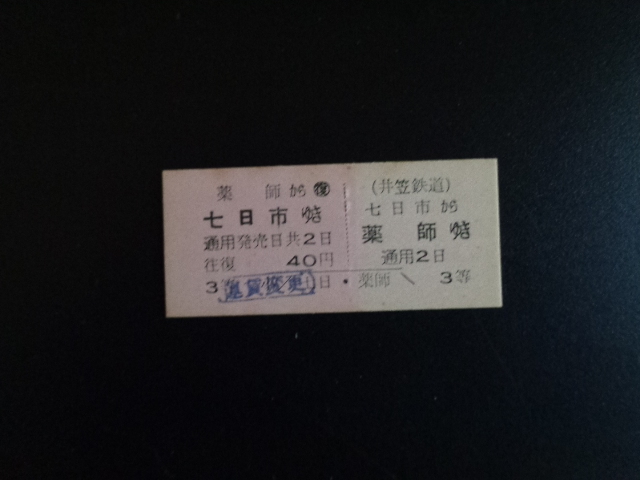 薬師から七日市ゆき【硬券・乗車券】井笠鉄道 40円(運賃変更印あり)