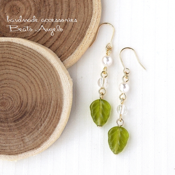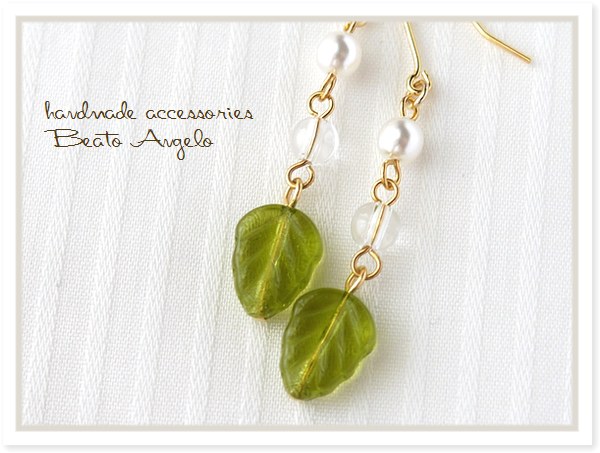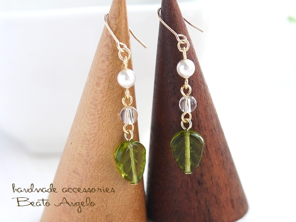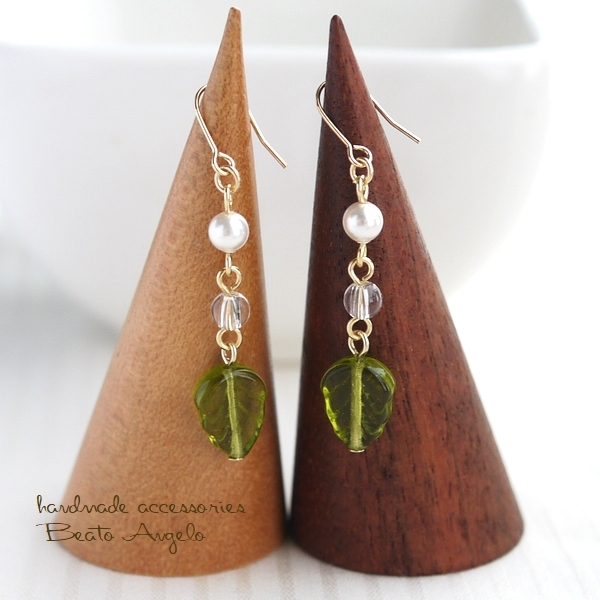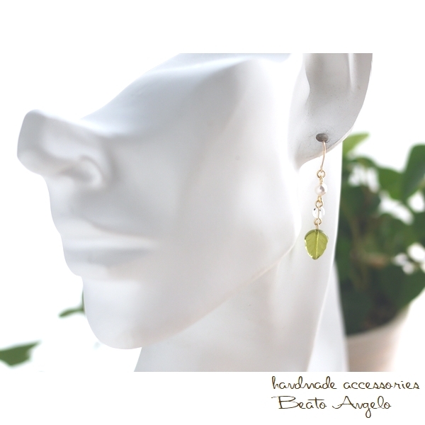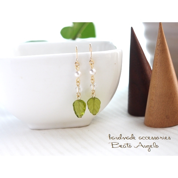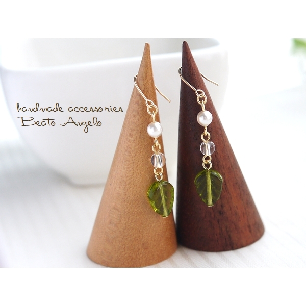 ◆◆+angelo+チェコリーフとクリスタルのピアス(p-047)オリーブ G 天然石 シンプル 夏 サマー チタン 樹脂 イヤリング
