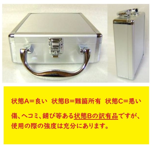 《商品説明》 新品未使用品になります。 状態A=良い 状態B=難箇所有 状態C=悪い 傷、ヘコミ、錆び等ある状態Bの訳有品になりますが、使用の際の強度は充分にあります。 画像は使いまわしておりますので、1点1点再撮影は行っておりません。 予め御了承くださいませ^^ タイトルにジュラルミンとあり、材質については詳しく判りませんが、 金属製である事に違いありません。 タイトルに色々書きましたが、用途としては色々お使い頂けると思います^^ 銀色仕様のLサイズになります。 外寸 16.3cm×20.5cm 高さ6cm 内寸 14.8cm×17cm 蓋を考慮しない下側だけの深さ3.8cm 【出品者指定便 送料0円】の場合 レターパックプラス(補償無 追跡有 対面受取)で出荷予定です。 |